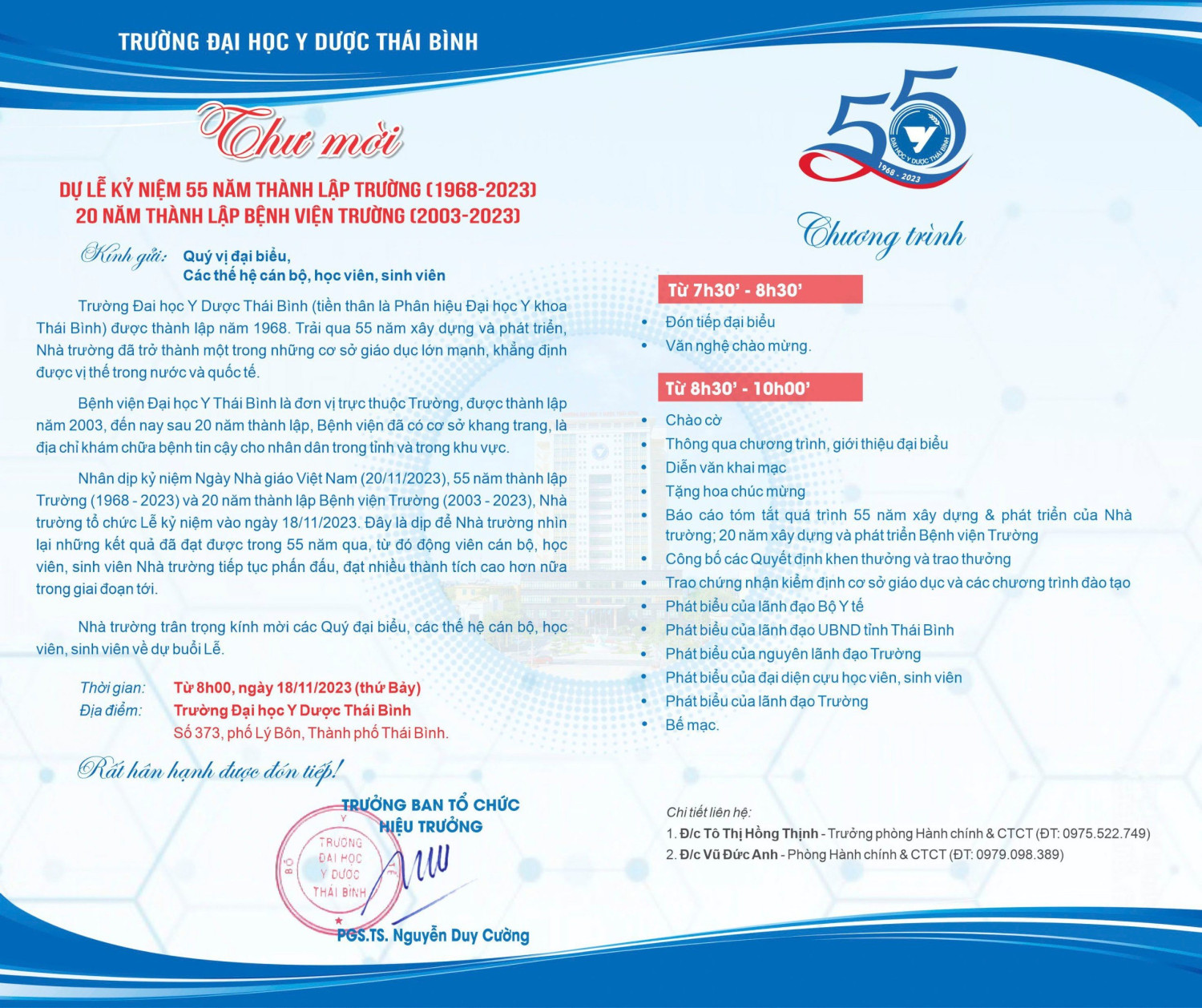 Thư mời dự Lễ kỷ niệm 55 năm thành lập Trường (1968-2023) 20 năm thành lập Bệnh viện trường (2003-2023)