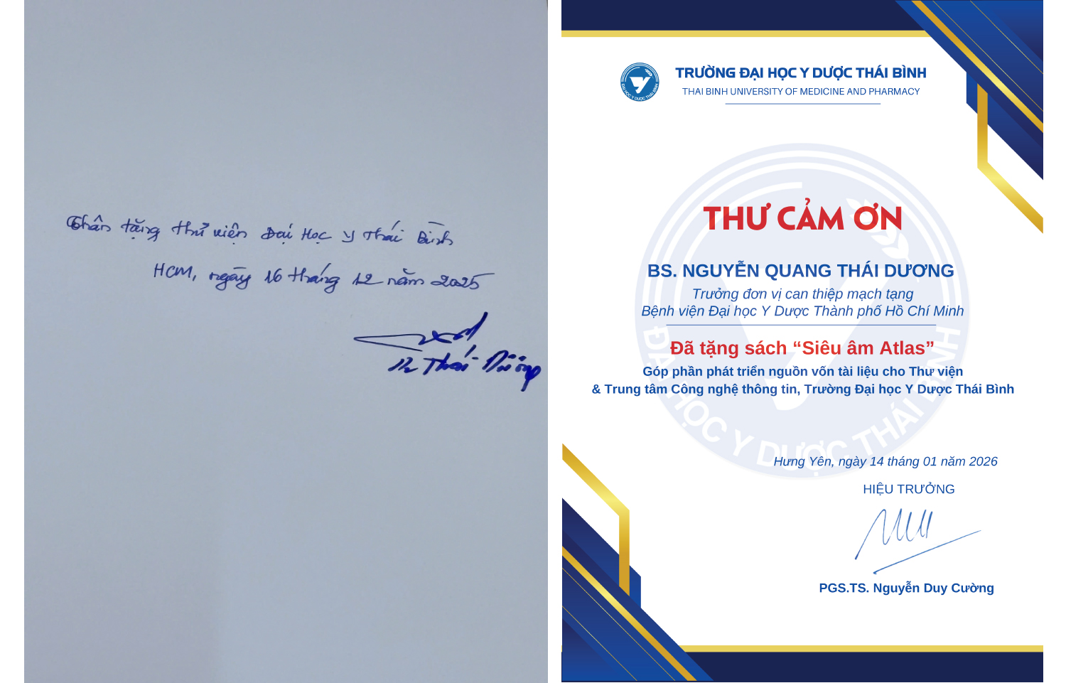 Thay mặt lãnh đạo Trường Đại học Y Dược Thái Bình, PGS.TS Nguyễn Duy Cường - Hiệu trưởng Nhà trường đã gửi thư cảm ơn ThS.BS Nguyễn Quang Thái Dương về những tình cảm của Bác sĩ với Nhà trường. Lãnh đạo và cán bộ, giảng viên Bộ môn Chẩn đoán hình ảnh trân trọng cảm ơn sự quan tâm của thầy Nguyễn Quang Thái Dương đối với Trường cũng như Bộ môn. Các sách Nhà trường nhận sẽ được chuyển vào Thư viện & Trung tâm CNTT, bổ sung vào nguồn tài liệu, phục vụ công tác giảng dạy cho các đối tượng đào tạo của Bộ môn.
