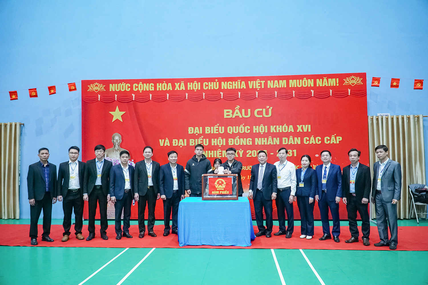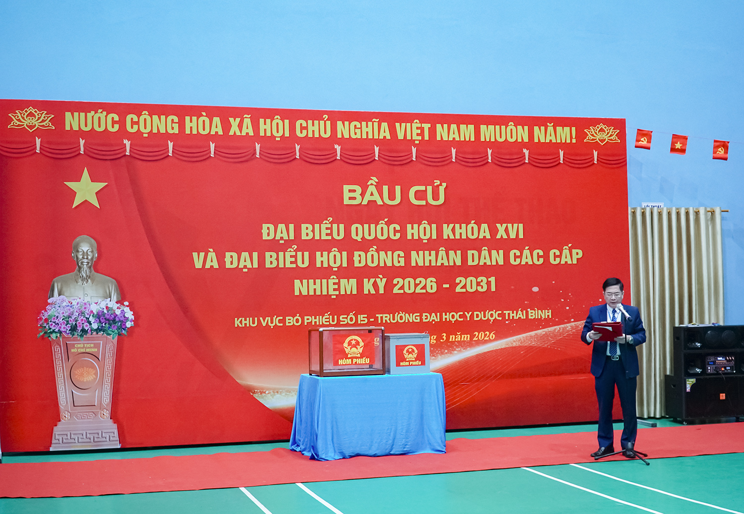 Đúng 6h45 phút, lễ khai mạc cuộc bầu cử đại biểu Quốc hội khóa XVI và bầu cử đại biểu Hội đồng nhân dân các cấp tỉnh Hưng Yên nhiệm kỳ 2026-2031 tại khu vực bỏ phiếu soos 15 - Trường Đại học Y Dược Thái Bình đã chính thức diễn ra.