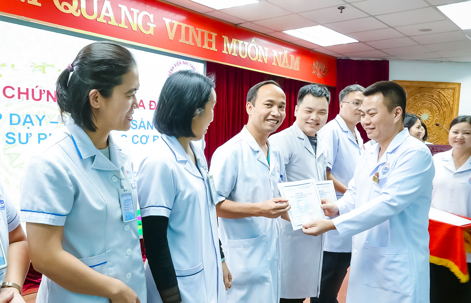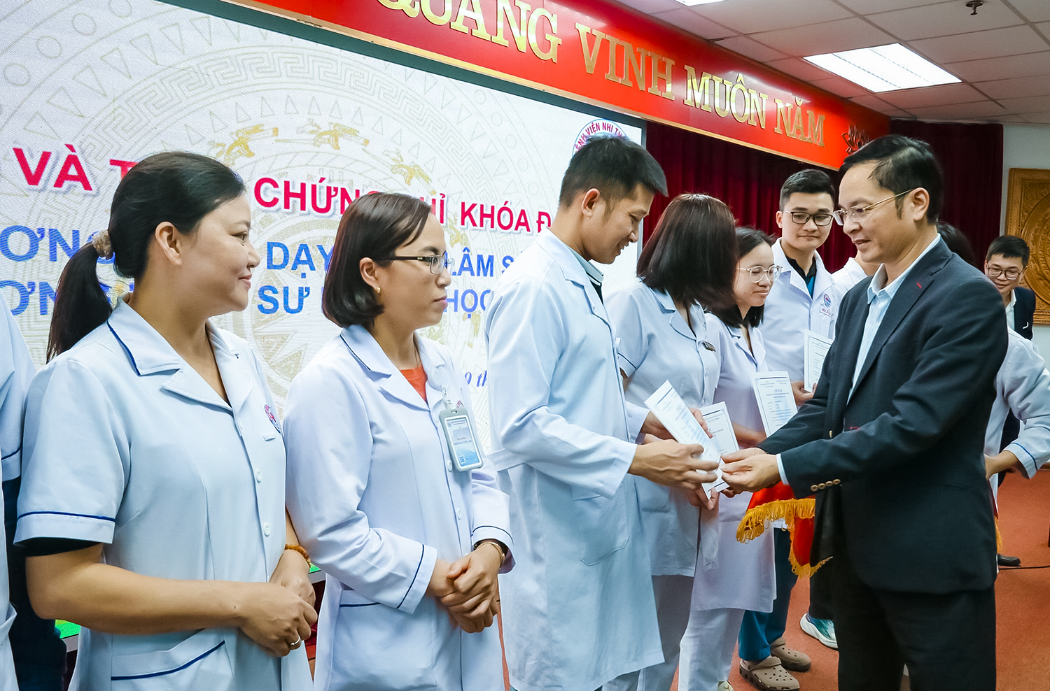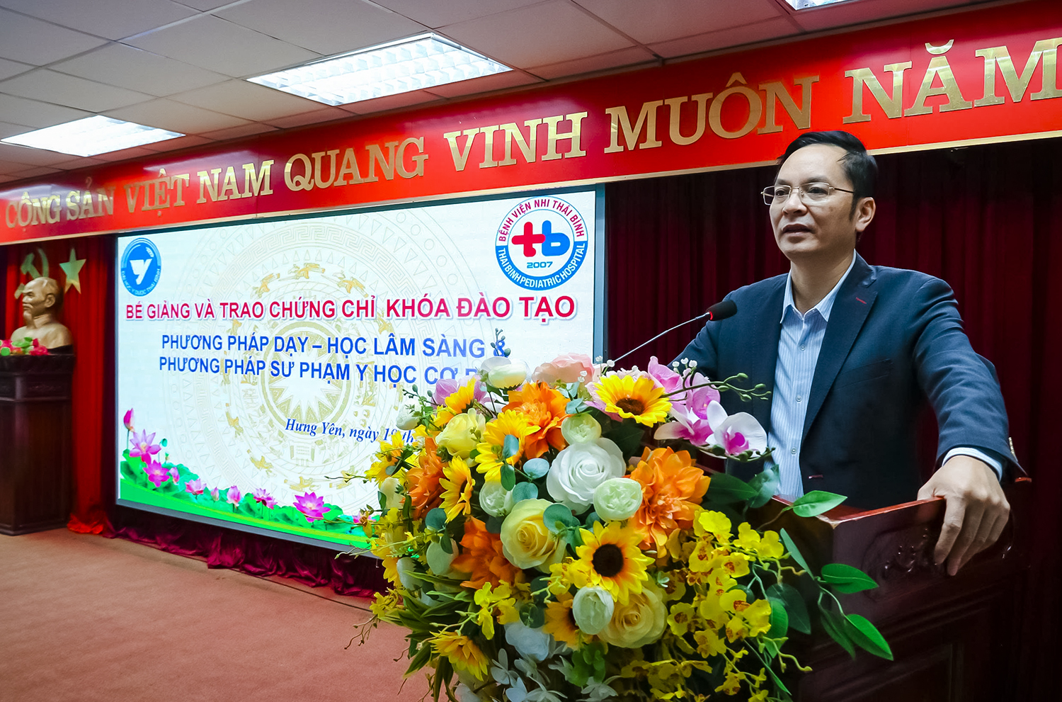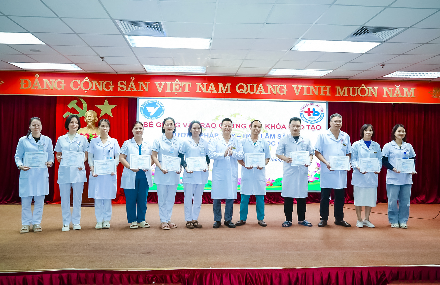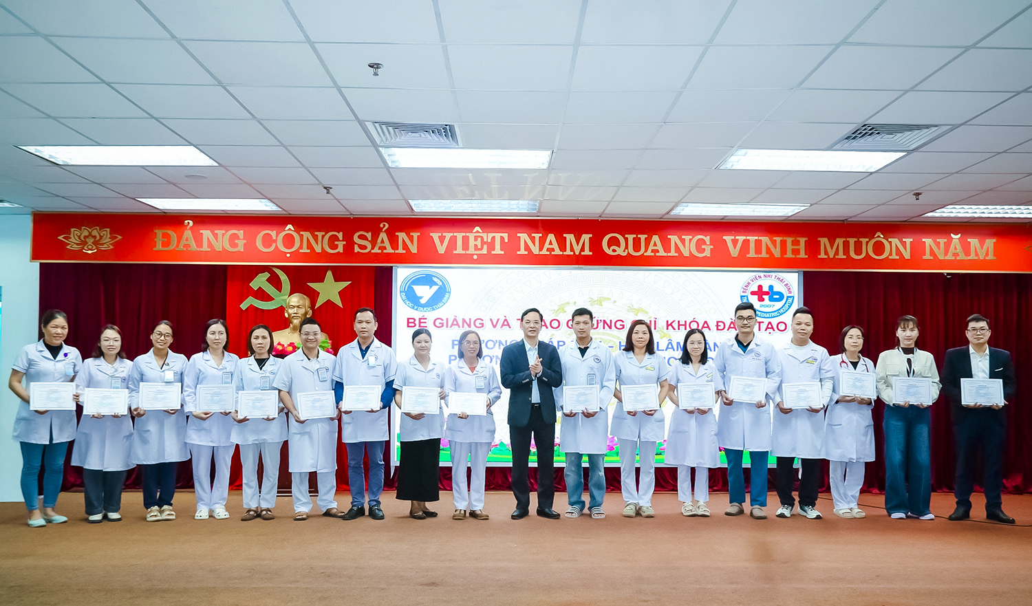 Chiều ngày 19/12/2025, buổi bế giảng và trao chứng chỉ cho các học viên đã được tổ chức tại Hội trường Đoàn Kết - Bệnh viện Nhi Thái Bình, tham dự buổi lễ có BS CKII Đỗ Mạnh Dũng - Phó Giám đốc Bệnh viện Nhi Thái Bình, BSCKII Trần Trọng Kiểm - Phó Giám đốc Bệnh viện Nhi Thái Bình. Về phía Trường Đại học Y Dược Thái Bình có có PGS.TS Nguyễn Xuân Bái - Phó Hiệu trưởng, Giám đốc Bệnh viện Trường; cùng các giảng viên và học viên tham gia khóa học.