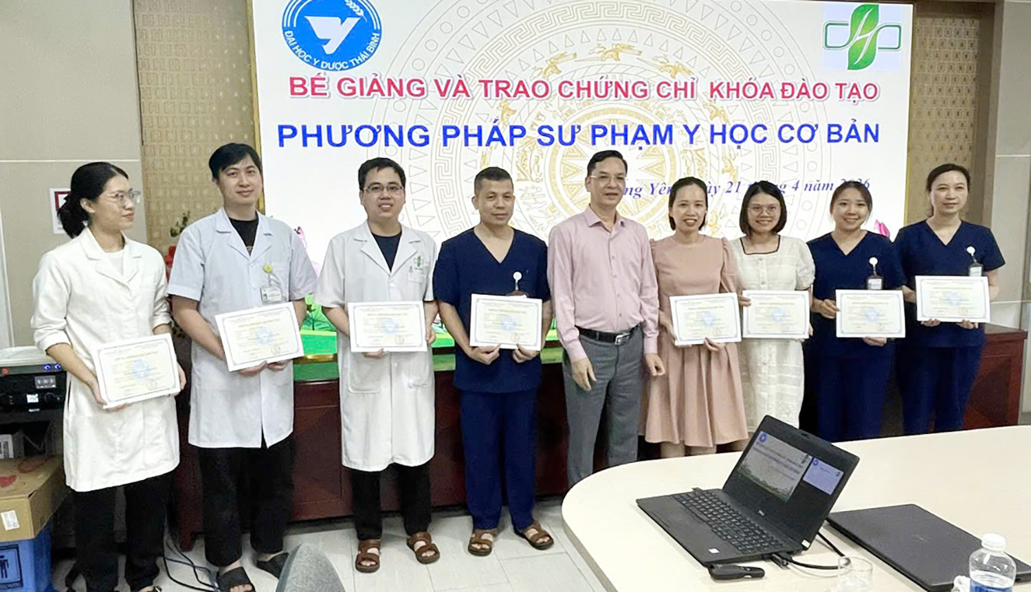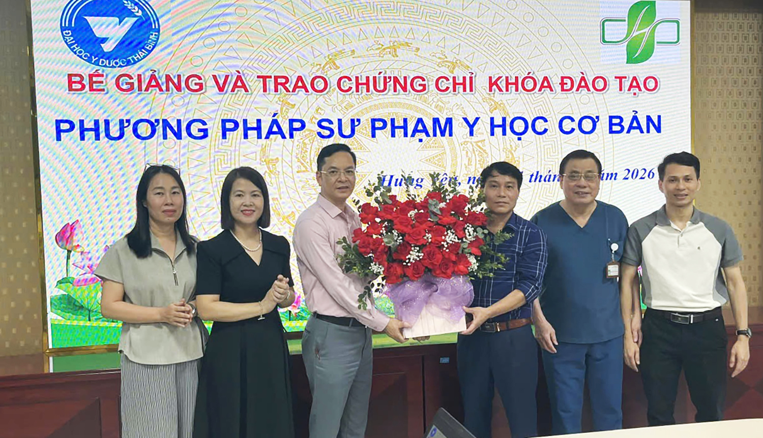 Thực hiện Quyết định số 701/QĐ-YDTB ngày 07/4/2026 của Hiệu trưởng Trường Đại học Y Dược Thái Bình về việc tổ chức khóa đào tạo liên tục (CME) “Phương pháp sư phạm Y học cơ bản”, Trung tâm Phát triển giảng viên triển khai giảng dạy cho đội ngũ cán bộ y tế Bệnh viện Đa khoa Lâm Hoa Thái Bình, tỉnh Hưng Yên theo đúng kế hoạch, từ ngày 07/4/2026 đến ngày 21/4/2026. Chiều ngày 21/4/2026, lễ bế giảng và trao chứng chỉ được tổ chức tại Bệnh viện Đa khoa Lâm Hoa Thái Bình.