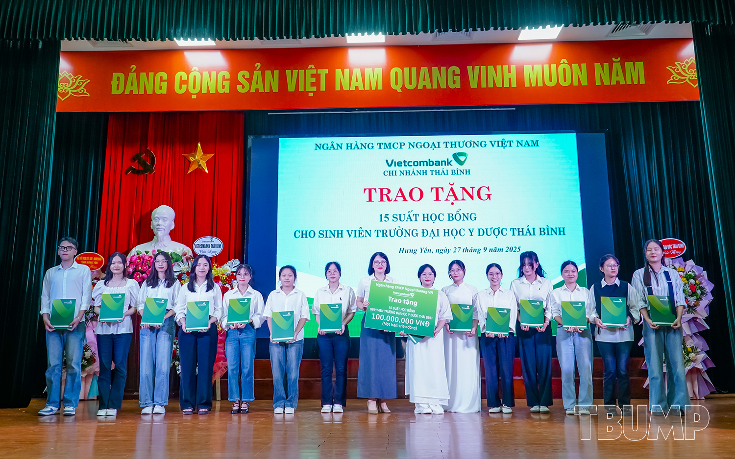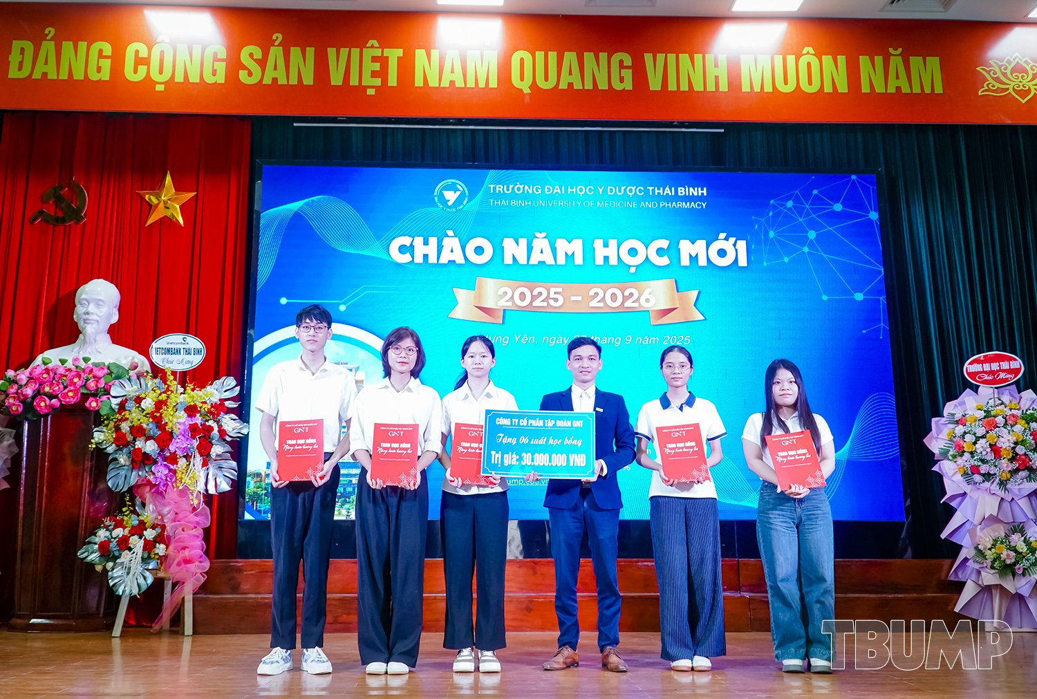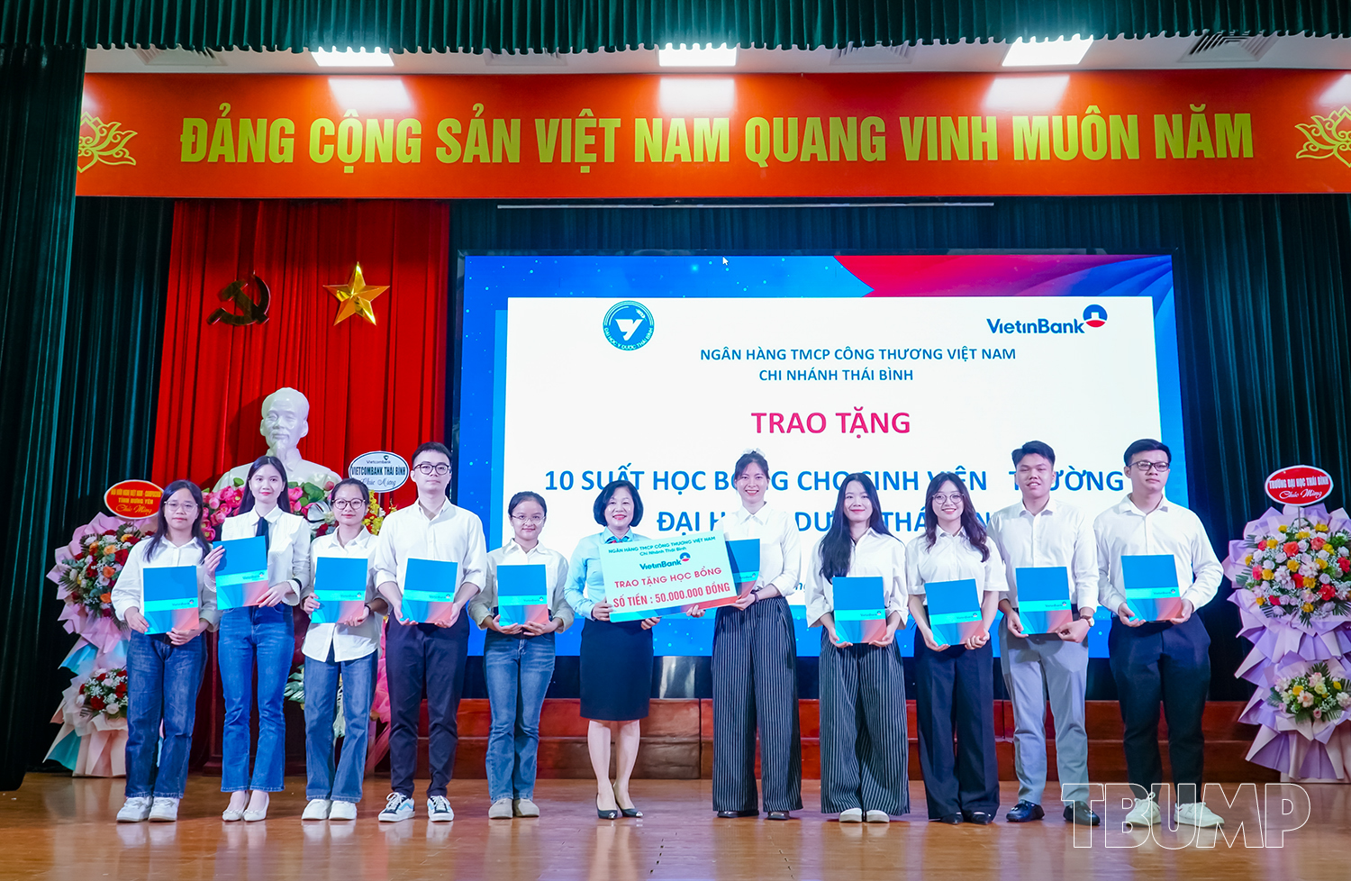 Đại diện lãnh đạo Ngân hàng TMCP Ngoại thương Việt Nam CN Thái Bình, Ngân hàng TMCP Công thương Việt Nam CN Thái Bình, Công ty TNHH Dược phẩm Hoa Linh, Công ty cổ phần Tập đoàn CNT và Tổ chức AGAPE đã trong học bổng cho các sinh viên xuất sắc, sinh viên có hoàn cảnh khó khăn, vượt khó vươn lên trong học tập.