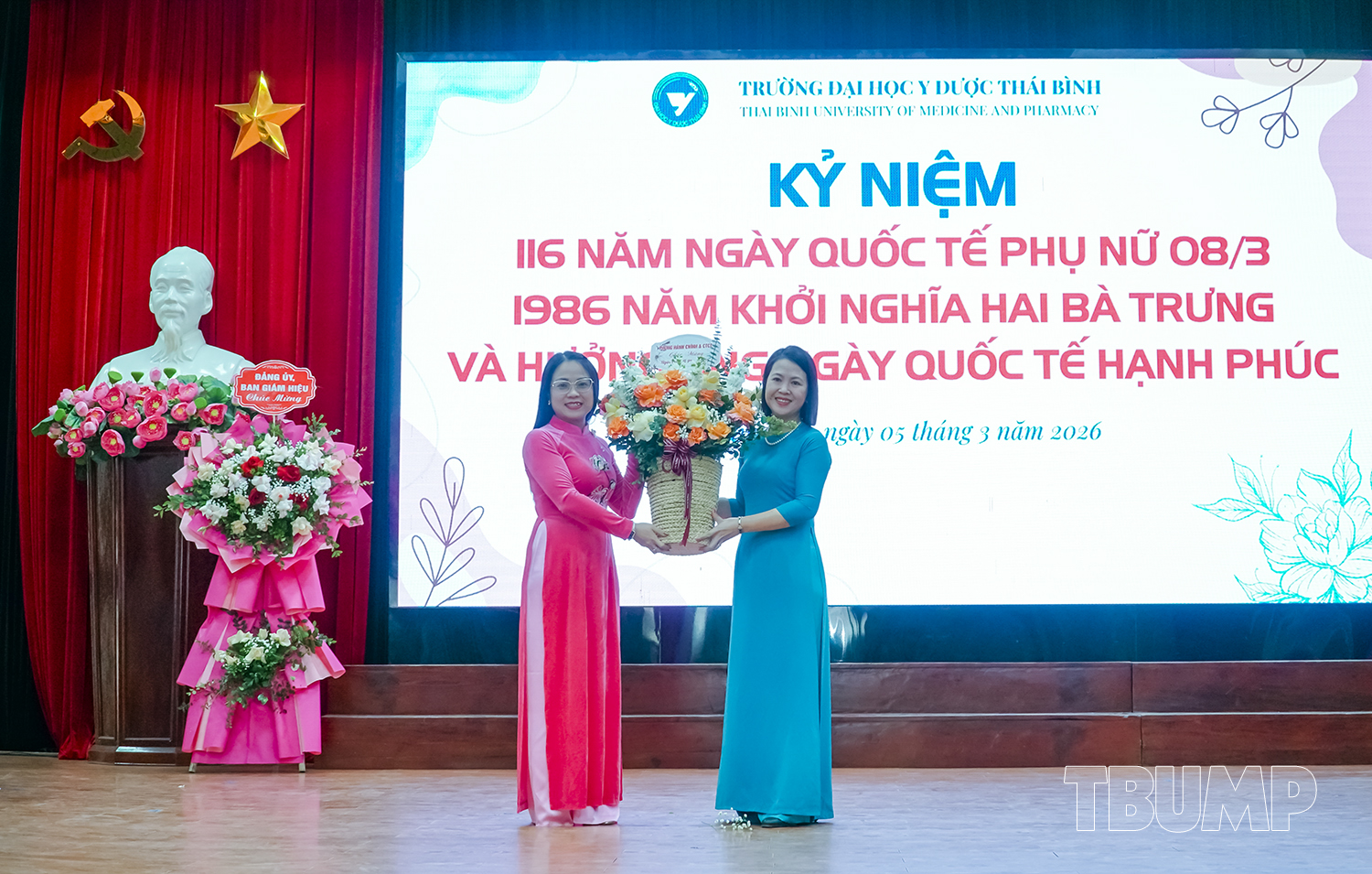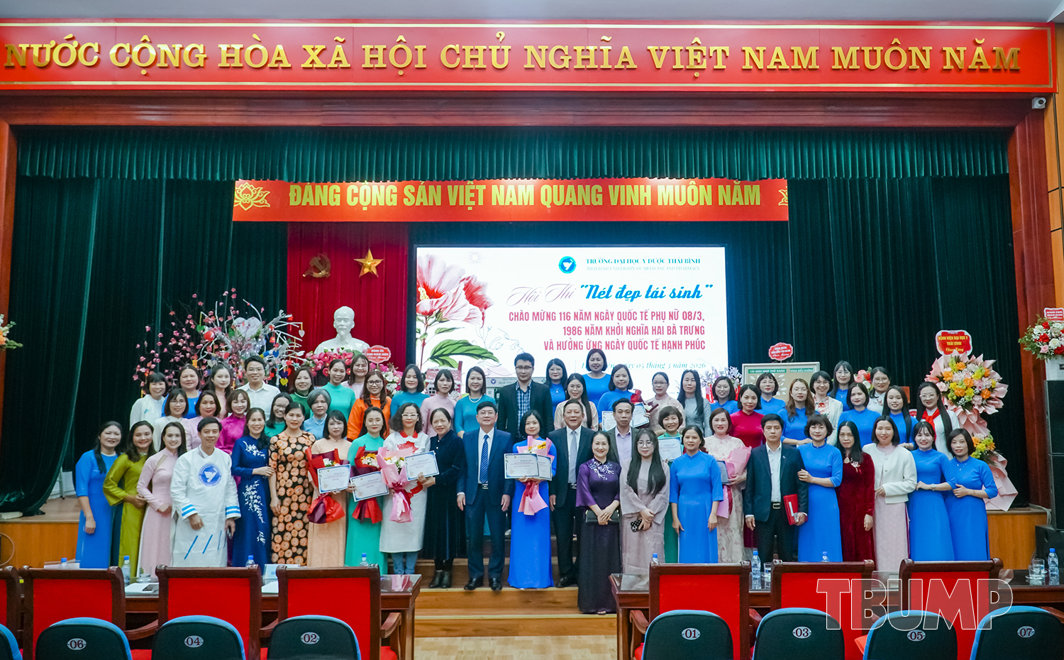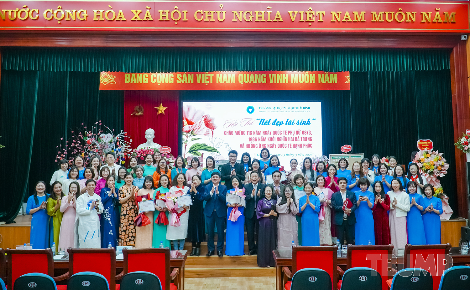 Hòa chung không khí tưng bừng của cả nước kỷ niệm 116 năm ngày quốc tế phụ nữ (8/3/1910 - 8/3/2026) và 1986 năm khởi nghĩa Hai Bà Trưng, nhằm khơi dậy và phát huy truyền thống đoàn kết yêu nước, tinh thần lao động sáng tạo của người phụ nữ Việt Nam, phát huy vai trò của nữ viên chức, người lao động Nhà trường, chiều ngày 05/3/2026, Ban Chấp hành Công đoàn và Ban Nữ công Trường Đại học Y Dược Thái Bình tổ chức chương trình kỷ niệm 116 năm ngày Quốc tế Phụ nữ, 1986 năm khởi nghĩa Hai Bà Trưng, hưởng ứng ngày Quốc tế hạnh phúc 20/3 và Hội thi “Nét đẹp tái sinh”.