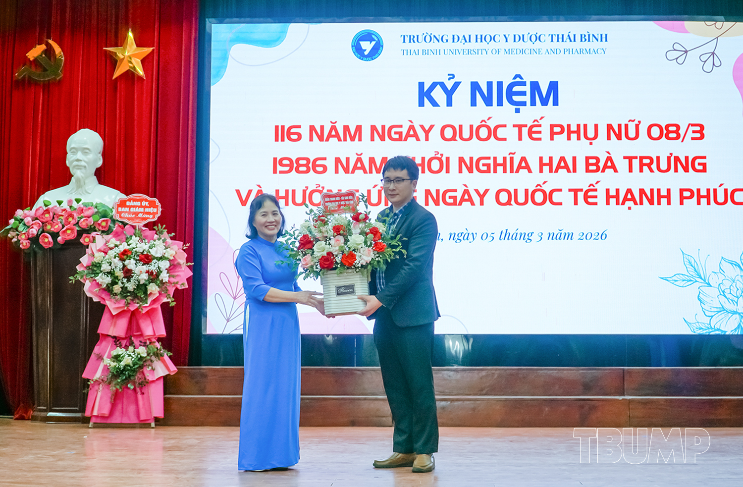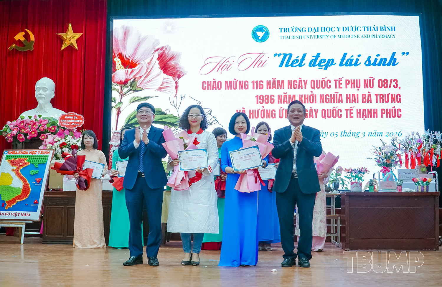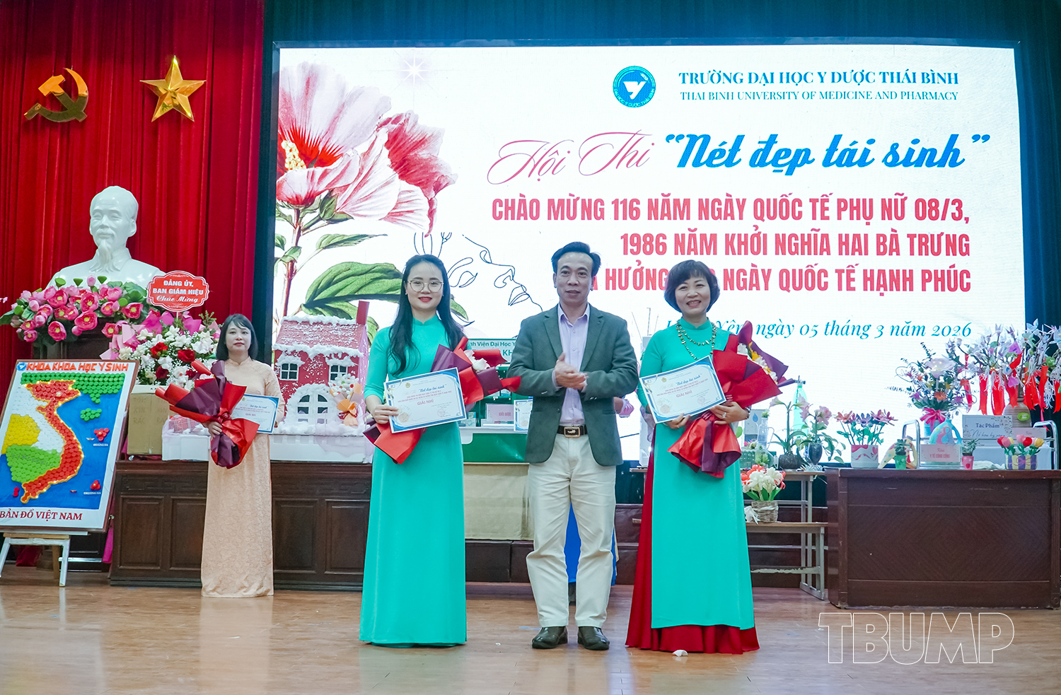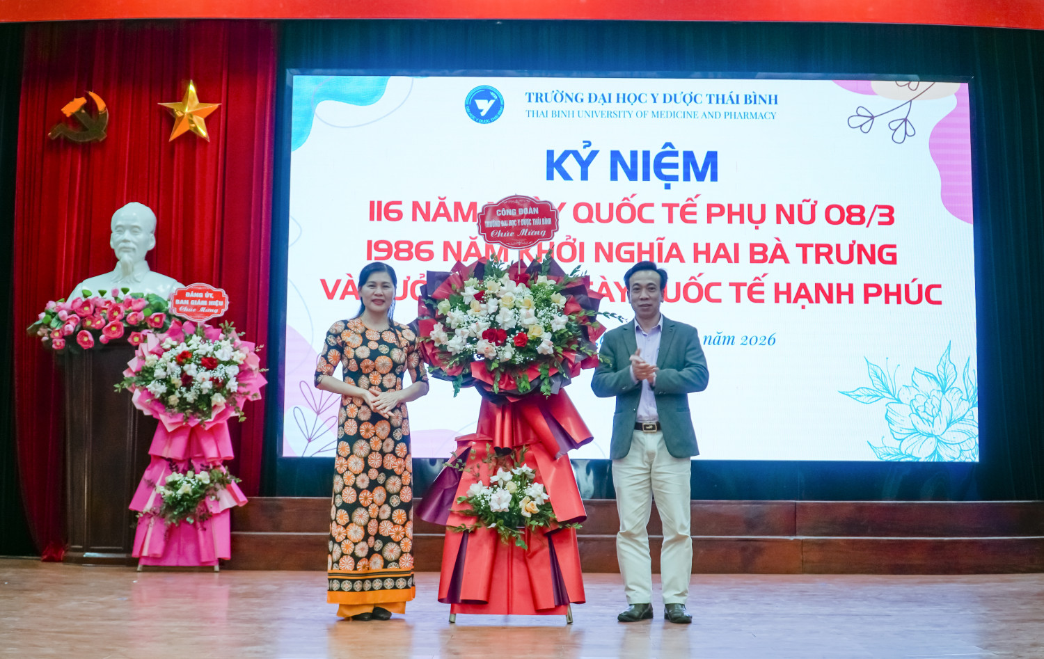Hòa chung không khí tưng bừng của cả nước kỷ niệm 116 năm ngày quốc tế phụ nữ (8/3/1910 - 8/3/2026) và 1986 năm khởi nghĩa Hai Bà Trưng, nhằm khơi dậy và phát huy truyền thống đoàn kết yêu nước, tinh thần lao động sáng tạo của người phụ nữ Việt Nam, phát huy vai trò của nữ viên chức, người lao động Nhà trường, chiều ngày 05/3/2026, Ban Chấp hành Công đoàn và Ban Nữ công Trường Đại học Y Dược Thái Bình tổ chức chương trình kỷ niệm 116 năm ngày Quốc tế Phụ nữ, 1986 năm khởi nghĩa Hai Bà Trưng, hưởng ứng ngày Quốc tế hạnh phúc 20/3 và Hội thi “Nét đẹp tái sinh”.