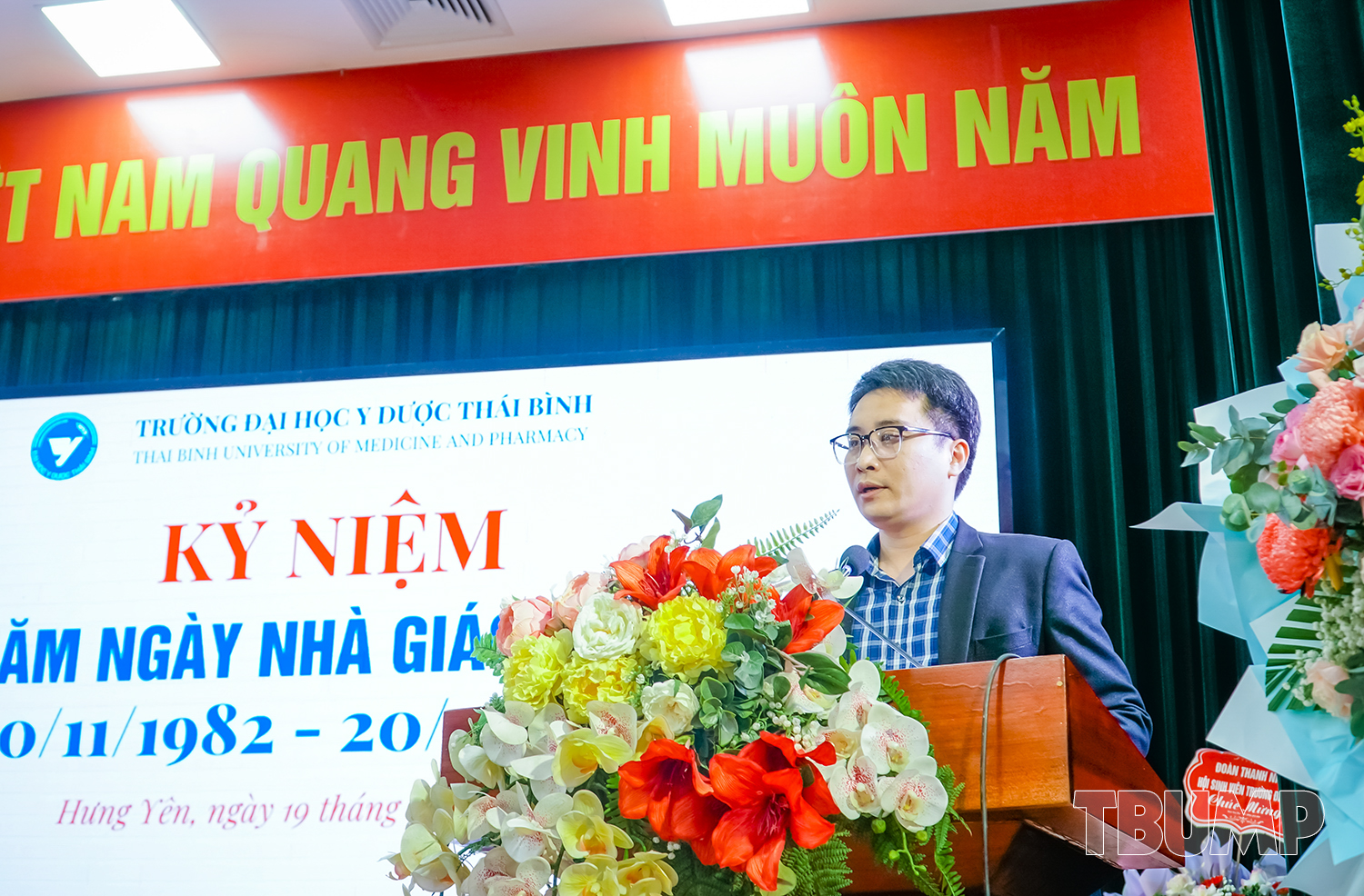 Thay mặt tuổi trẻ Nhà trường, ThS.BSNT Phạm Tuấn Đạt - Bí thư Đoàn thanh niên - Chủ tịch Hội sinh viên đã gửi những lời chúc mừng tốt đẹp nhất tới toàn thể các thế hệ thầy giáo, cô giáo, CBVC, người lao động Nhà trường nhân kỷ niệm ngày Hiến chương các nhà giáo 20/11. Với nhiệt huyết của tuổi trẻ, đoàn viên, sinh viên Trường Đại học Y Dược Thái Bình quyết tâm phấn đấu, rèn luyện, xứng đáng với truyền thống mái trường Anh hùng gần 60 năm xây dựng và trưởng thành.