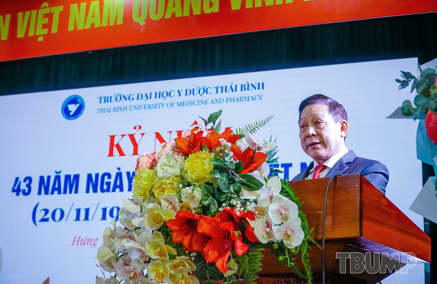 Thay mặt Ban Giám hiệu, PGS.TS Nguyễn Duy Cường - Hiệu trưởng Nhà trường trân trọng cảm ơn và tri ân những công lao, đóng góp của các thế hệ thầy giáo, cô giáo, CBVC, người lao động Nhà trường trong suốt chiều dài gàn 60 năm xây dựng và phát triển. Thầy Hiệu trưởng đã kêu gọi toàn thể cán bộ viên chức, học viên, sinh viên trong toàn Trường đoàn kết, tập trung trí tuệ, quyết tâm xây dựng Trường Đại học Y Dược Thái Bình trở thành trung tâm y dược của khu vực, của cả nước và hội nhập quốc tế.
