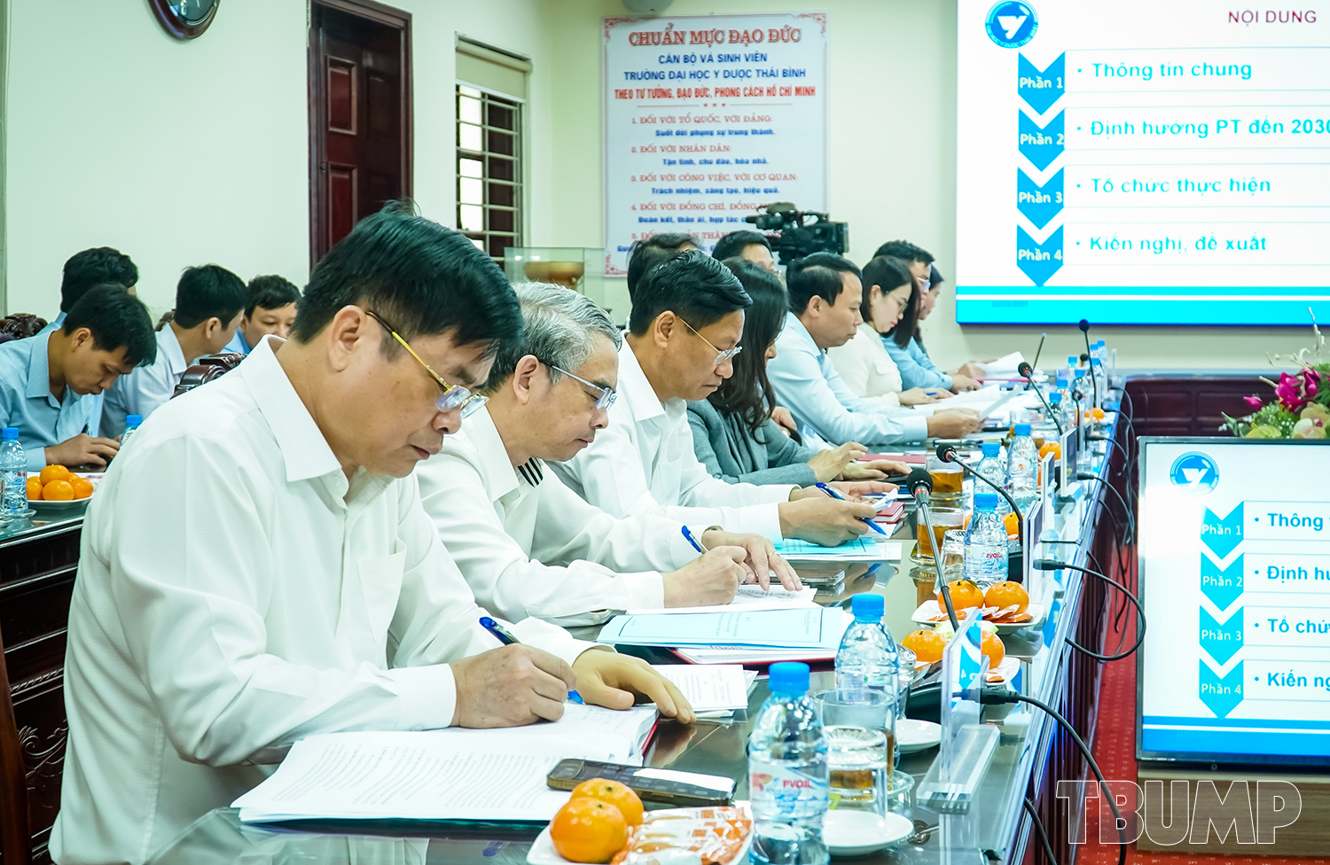 Tại buổi làm việc, lãnh đạo UBND tỉnh cùng đại diện lãnh đạo các Sở, Ban, Ngành đã góp ý về định hướng phát triển Trường Đại học Y Dược Thái Bình đến năm 2030, tầm nhìn đến năm 2045. Với đề án xây dựng Trường Đại học Y Dược Thái Bình đạt chuẩn cơ sở giáo dục theo mô hình trường đại học thông minh là bước đi cần thiết giúp Trường nâng cao chất lượng đào tạo, chuẩn hóa quy trình quản lý, giảng dạy, phát triển nghiên cứu khoa học ứng dụng trong chăm sóc sức khỏe nhân dân và tăng cường hợp tác quốc tế. Với nhiệm vụ chăm sóc, bảo vệ và nâng cáo sức khỏe nhân dân, các đại biểu mong muốn Nhà trường tiếp tục hỗ trợ, bồi dưỡng, nâng cao chất lượng đội ngũ cán bộ y tế cơ sở, đáp ứng nhu cầu khám chữa bệnh của người dân, đảm bảo an sinh xã hội.