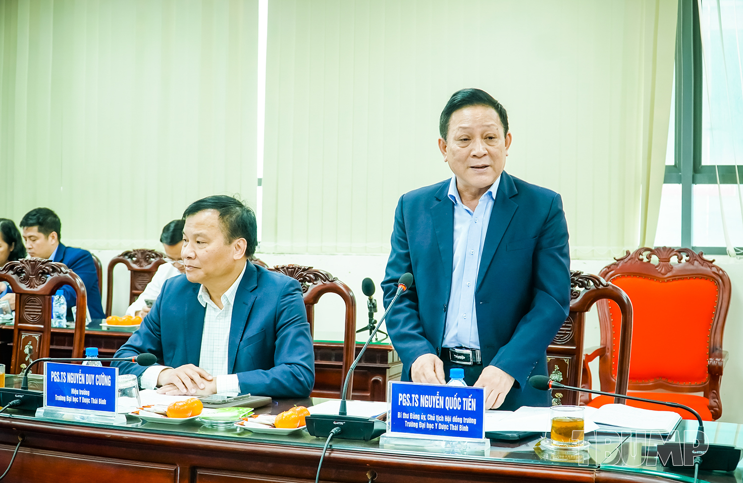 Thay mặt lãnh đạo Nhà trường, PGS.TS Nguyễn Quốc Tiến – Bí thư Đảng ủy, Chủ tịch Hội đồng trường đã báo cáo tóm tắt định hướng phát triển Trường Đại học Y Dược Thái Bình đến năm 2030, tầm nhìn đến năm 2045. Báo cáo nhấn mạnh: Căn cứ vào chiến lược phát triển Trường Đại học Y Dược Thái Bình đến năm 2025 tầm nhìn đến năm 2035; với quy mô đào tạo đến năm 2030 dự kiến là 12.000 người học, Nhà trường cần quỹ đất đảm bảo chuẩn cơ sở giáo dục đại học là 60 ha (tính cả hệ số dự trữ). Với mục tiêu xây dựng Trường Đại học Y Dược Thái Bình đạt chuẩn cơ sở giáo dục đại học theo mô hình Trường Đại học thông minh, đảm bảo phương án quy hoạch đồng bộ theo mô hình “Trường – Viện – Bệnh viện trong cùng khu phức hợp”, đảm bảo tính liên thông, thân thiện với môi trường, với tỷ lệ cây xanh trên 40%... Nhà trường kiến nghị UBND tỉnh chấp nhận chủ trương đầu tư và bố trí quỹ đất 50ha trong quy hoạch đã được giải phóng mặt bằng, san lấp, hỗ trợ kinh phí thực hiện dự án bằng nguồn kinh phí của tỉnh.
