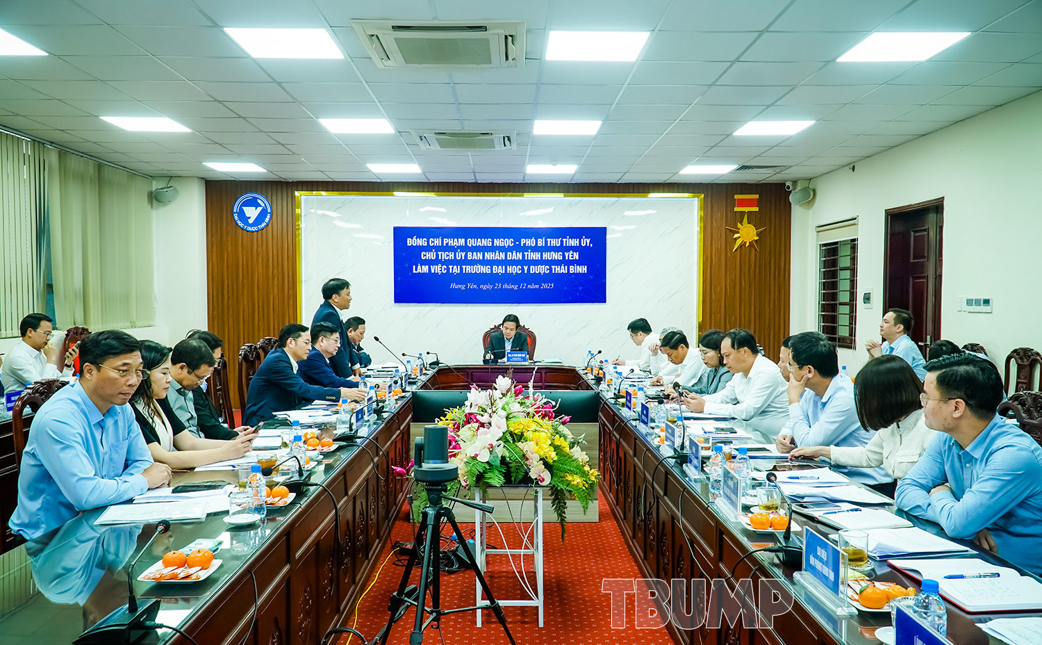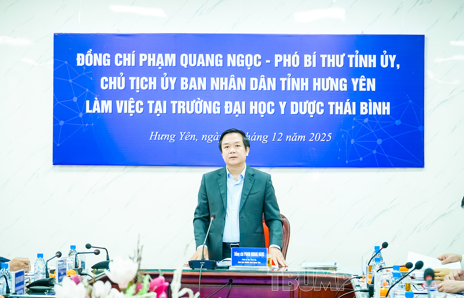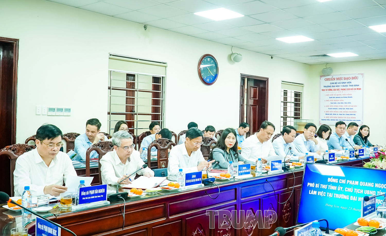 Phát biểu tại buổi làm việc, đồng chí Phạm Quang Ngọc - Phó Bí thư Tỉnh ủy, Chủ tịch UBND tỉnh ghi nhận và đánh giá cao vị thế, vai trò và những thành tựu to lớn của Trường Đại học Y Dược Thái Bình trong suốt quá trình gần 60 năm xây dựng và phát triển. Hình thành từ khói lửa của cuộc kháng chiến chống Mỹ cứu nước, những thăng trầm, cùng sự phát triển của Nhà trường luôn gắn liền với lịch sử, với con người và mảnh đất Thái Bình xưa (nay là Hưng Yên).