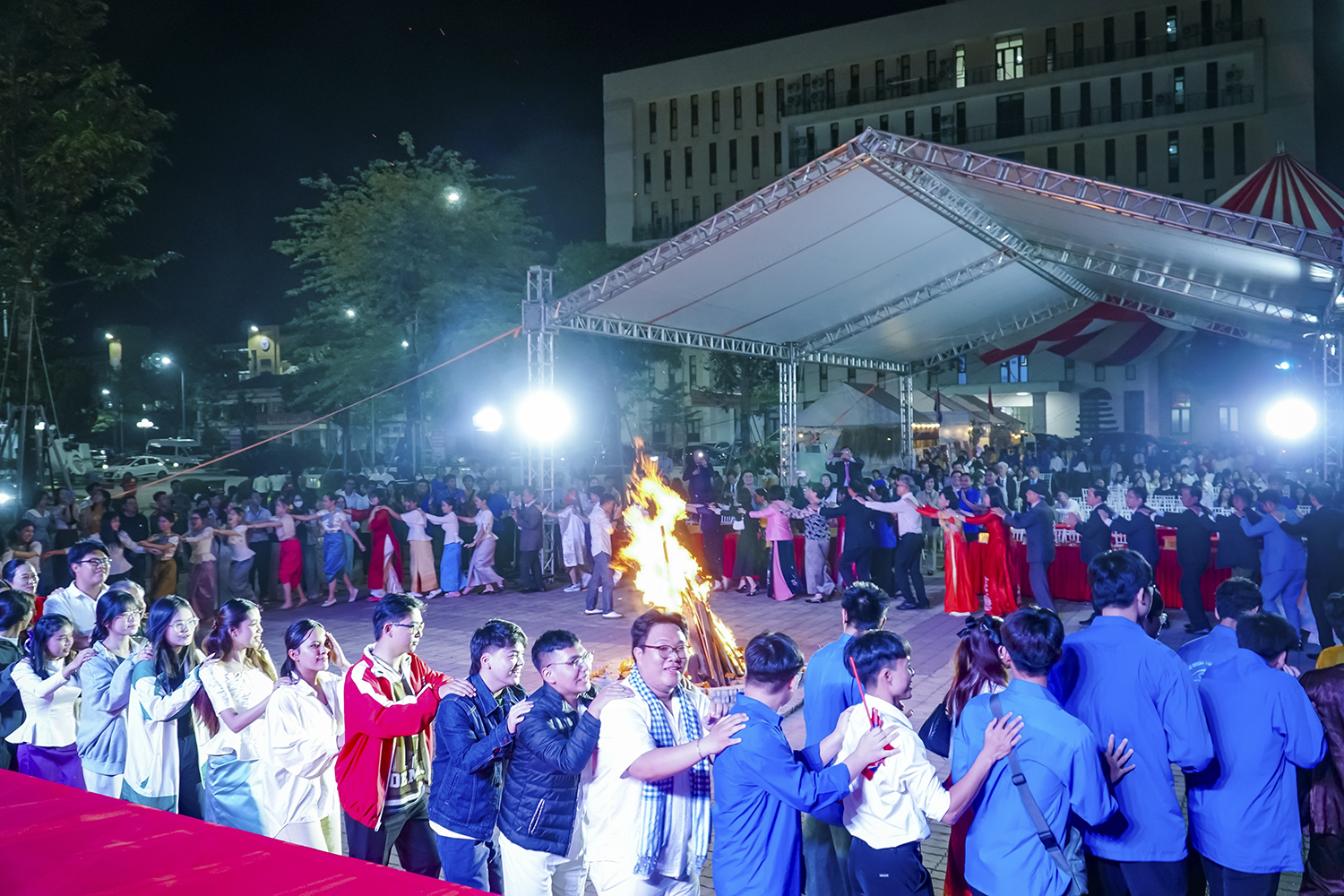 Đại biểu và sinh viên cùng hát vang "Việt Nam – Campuchia Samaki" và "Nối vòng tay lớn" bên lửa trại trong Chương trình giao lưu sinh viên Việt Nam - Campuchia. (Ảnh: KT)
