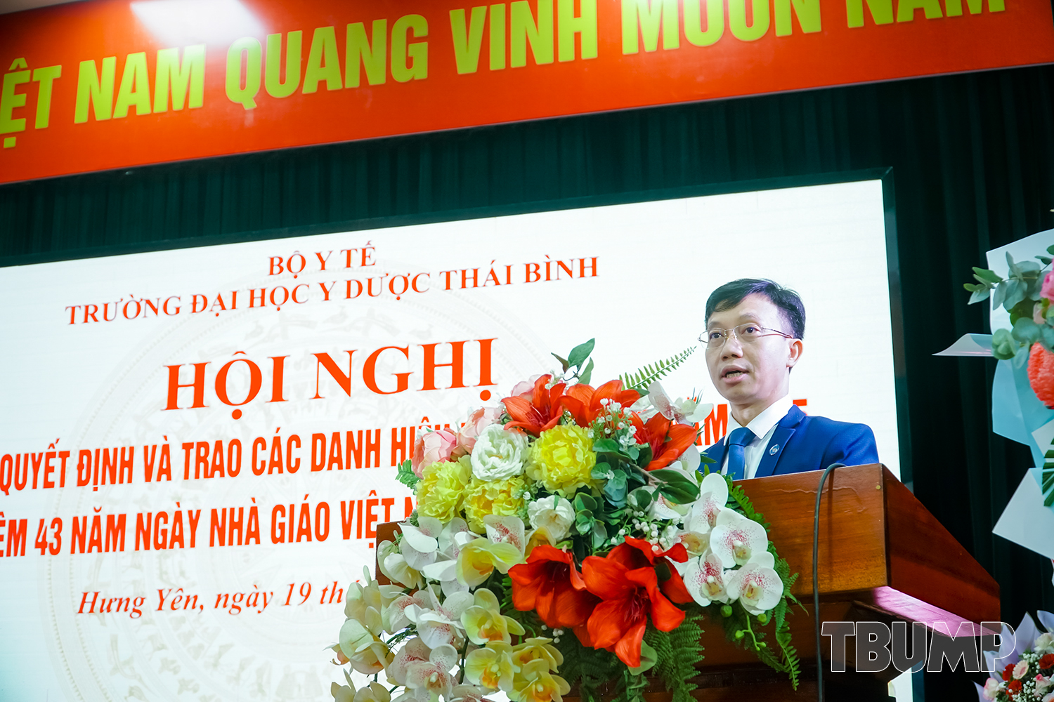 Chào mừng kỷ niệm 43 năm ngày Nhà giáo Việt Nam là dịp để tôn vinh, tri ân các thế hệ thầy giáo, cô giáo, viên chức, người lao động đã và đang cống hiến cho sự nghiệp đào tạo, sự nghiệp Y tế, cho sự phát triển của Trường Đại học Y Dược Thái Bình. Năm học 2025 - 2026 với rất nhiều thời cơ, xong cũng còn không ít những khó khăn, thử thách. Thầy và trò Nhà trường nguyện đoàn kết, đồng lòng, thực hiện thắng lợi nhiệm vụ năm học, xây dựng Trường Đại học Y Dược Thái Bình thông minh, hiện đại, đáp ứng yêu cầu phát triển của xã hội.