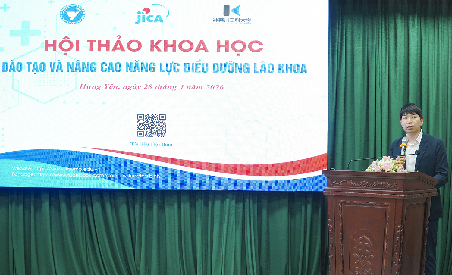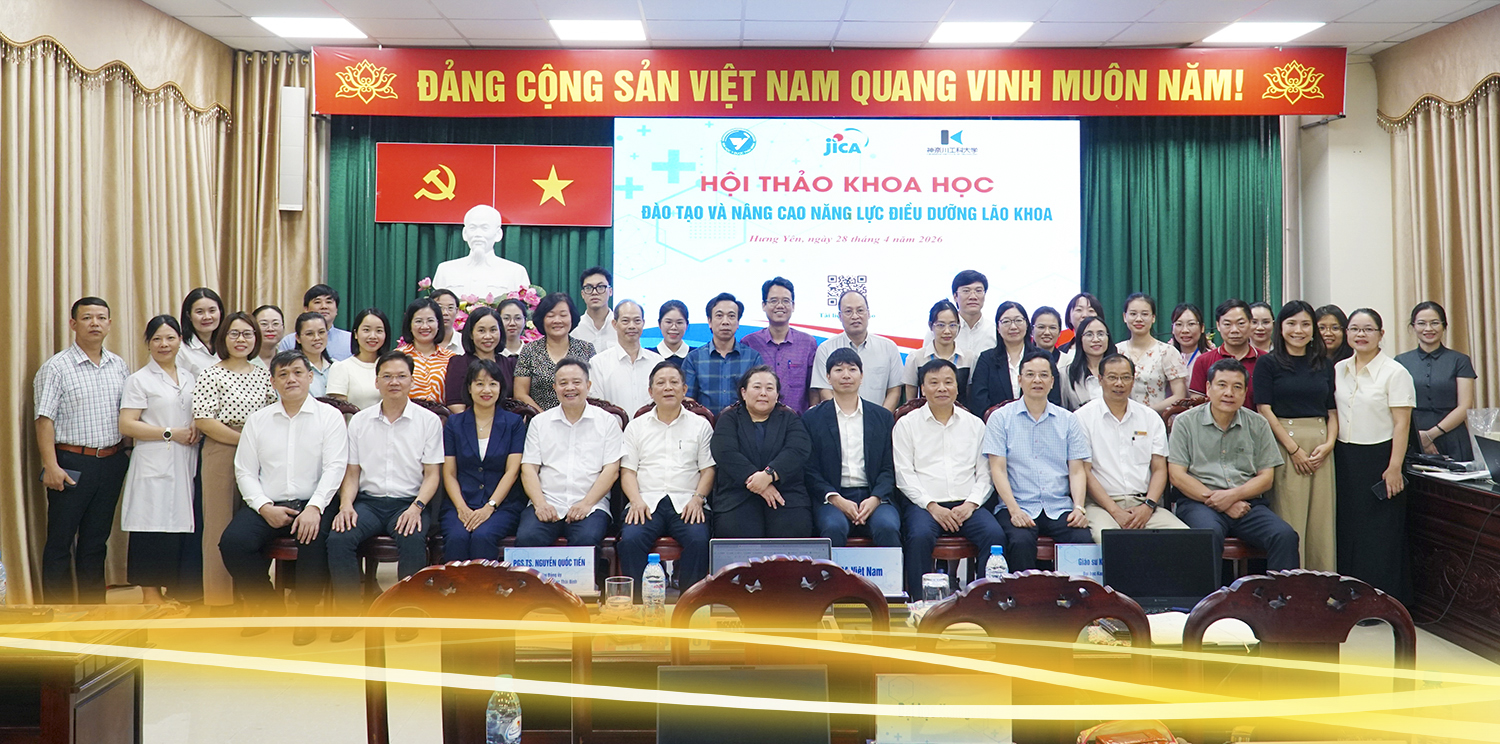 Nhằm đánh giá thực trạng già hóa dân số, nhu cầu chăm sóc sức khỏe người cao tuổi tại Việt Nam, đồng thời góp phần nâng cao chất lượng đào tạo trong lĩnh vực điều dưỡng lão khoa, sáng ngày 28/4/2026, Trường Đại học Y Dược Thái Bình phối hợp với Trường Đại học Kanagawa (Nhật Bản) tổ chức Hội thảo khoa học “Đào tạo Điều dưỡng lão khoa các trường Đại học khu vực phía Bắc Việt Nam” với chủ đề “Già hóa dân số và vấn đề đào tạo điều dưỡng lão khoa”.