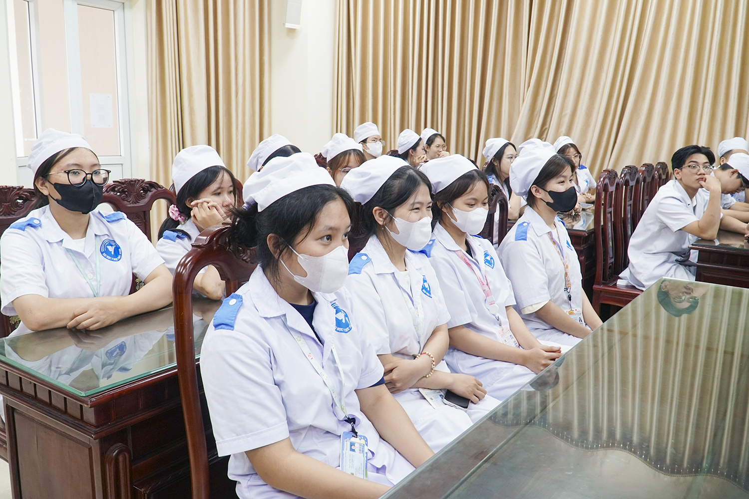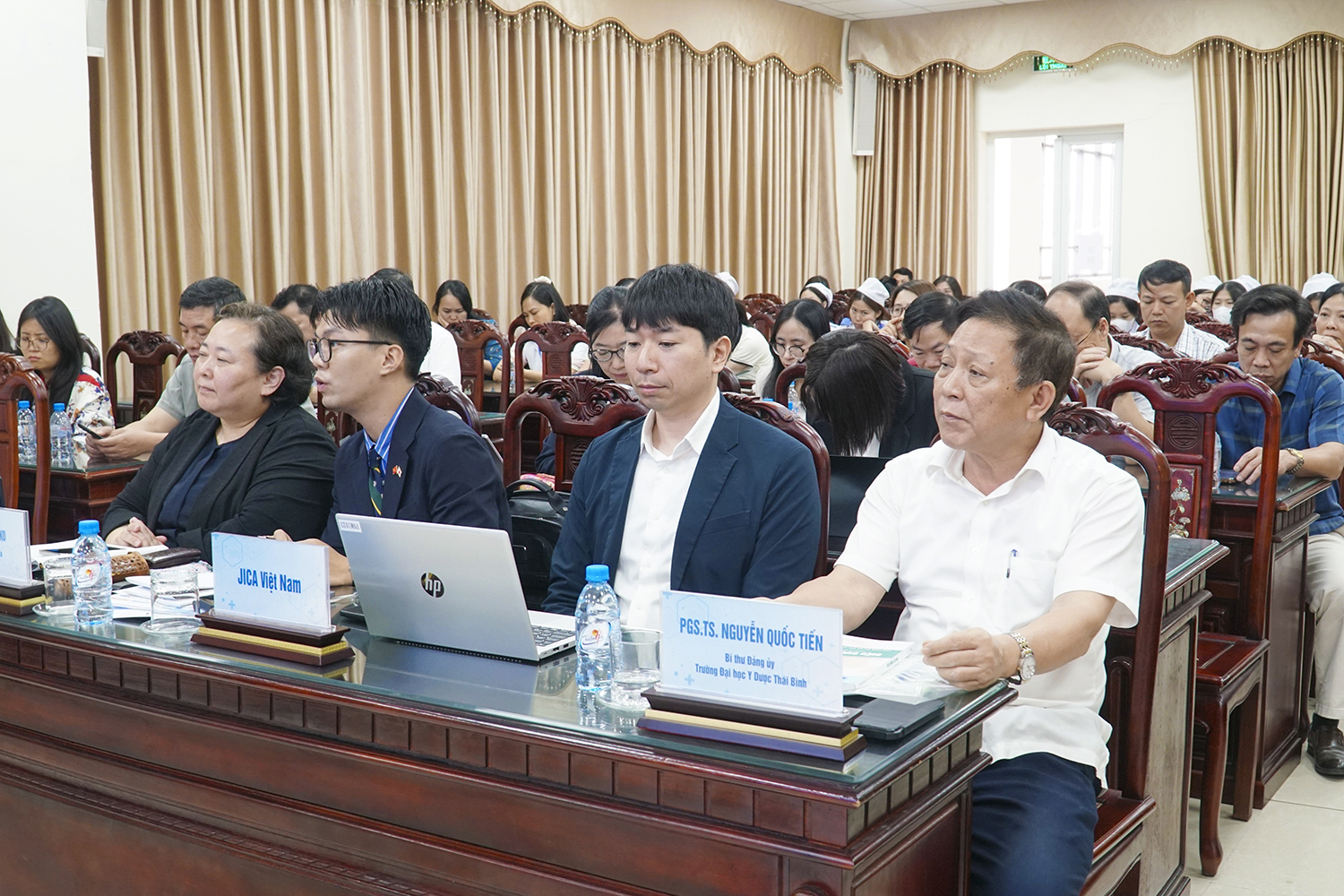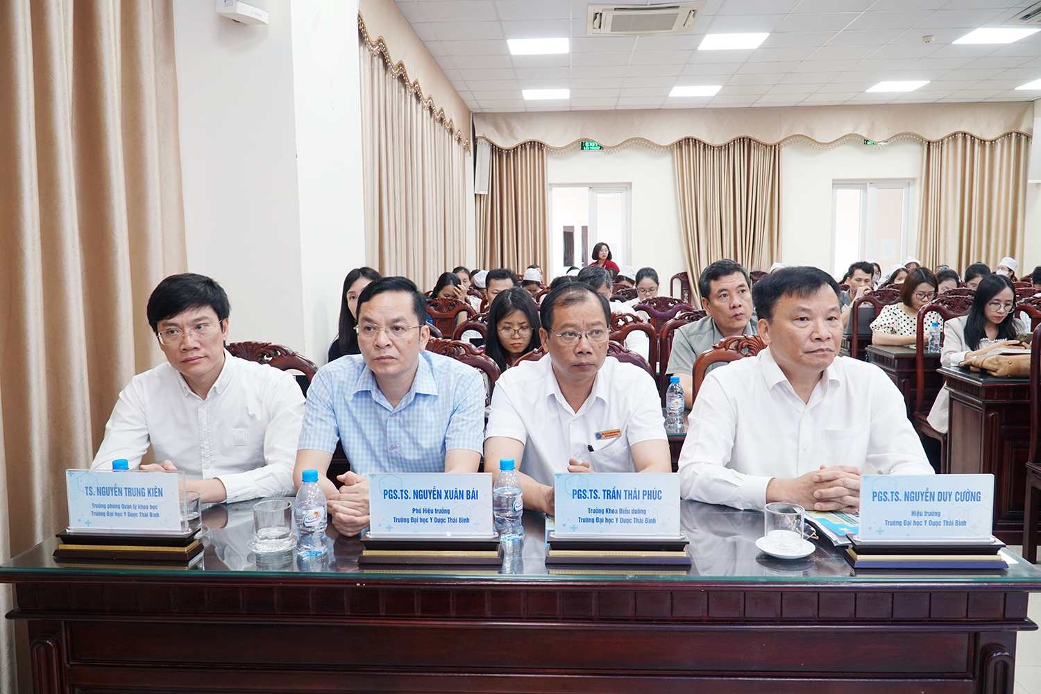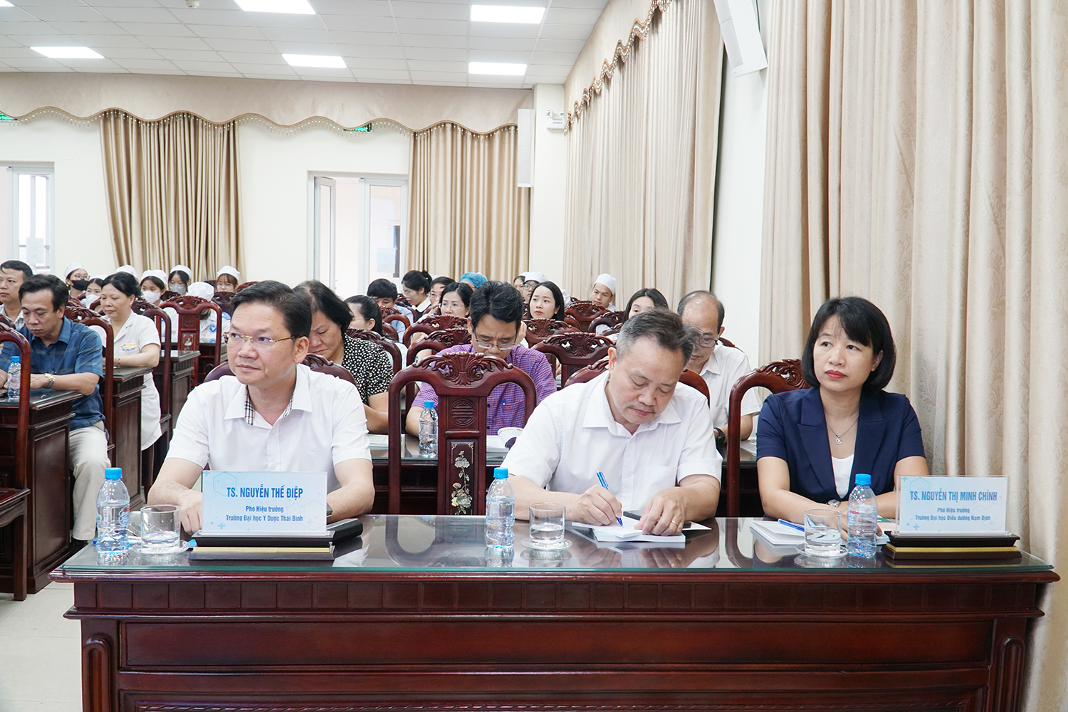 Về phía Trường Đại học Y Dược Thái Bình, có PGS.TS Nguyễn Quốc Tiến - Bí thư Đảng uỷ; PGS.TS Nguyễn Duy Cường - Hiệu trưởng Nhà trường; cùng các đồng chí trong Đảng uỷ, Ban Giám hiệu; các giảng viên Khoa Điều dưỡng và đại diện các phòng, ban liên quan.