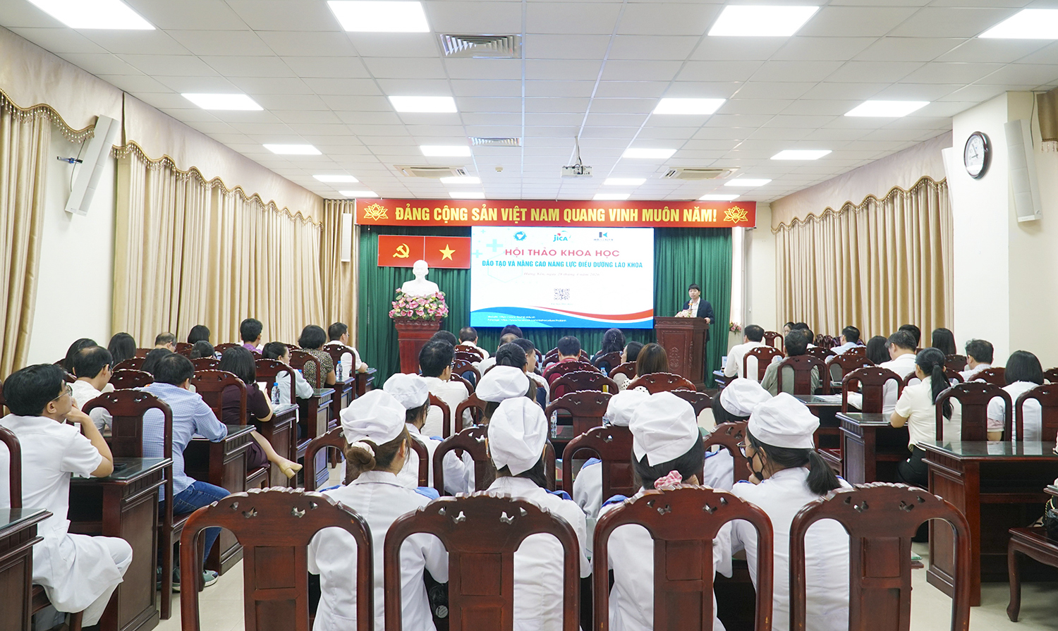 Phát biểu tại hội thảo, ông Kawamura Hiroaki - Điều phối viên phòng NG-JICA đã giới thiệu những kết quả nổi bật trong khuôn khổ hoạt động Dự án hợp tác “Thí điểm giới thiệu, hỗ trợ đào tạo và thực hành điều dưỡng lão khoa”. Đáng chú ý, bộ “Giáo trình đào tạo điều dưỡng lão khoa dùng cho đại học và sau đại học” đã được nghiên cứu, biên soạn công phu, tổ chức thí điểm tại một số cơ sở đào tạo và bước đầu ghi nhận hiệu quả tích cực. Bộ giáo trình được kỳ vọng sẽ trở thành tài liệu chuẩn, góp phần thống nhất nội dung đào tạo, nâng cao chất lượng giảng dạy và từng bước tiếp cận các chuẩn mực quốc tế. Những kết quả này tiếp tục khẳng định hiệu quả hợp tác bền vững giữa các cơ sở đào tạo của Việt Nam với các đối tác Nhật Bản, đồng thời mở ra nhiều cơ hội phát triển trong lĩnh vực đào tạo nguồn nhân lực y tế, đặc biệt là điều dưỡng lão khoa trong thời gian tới.