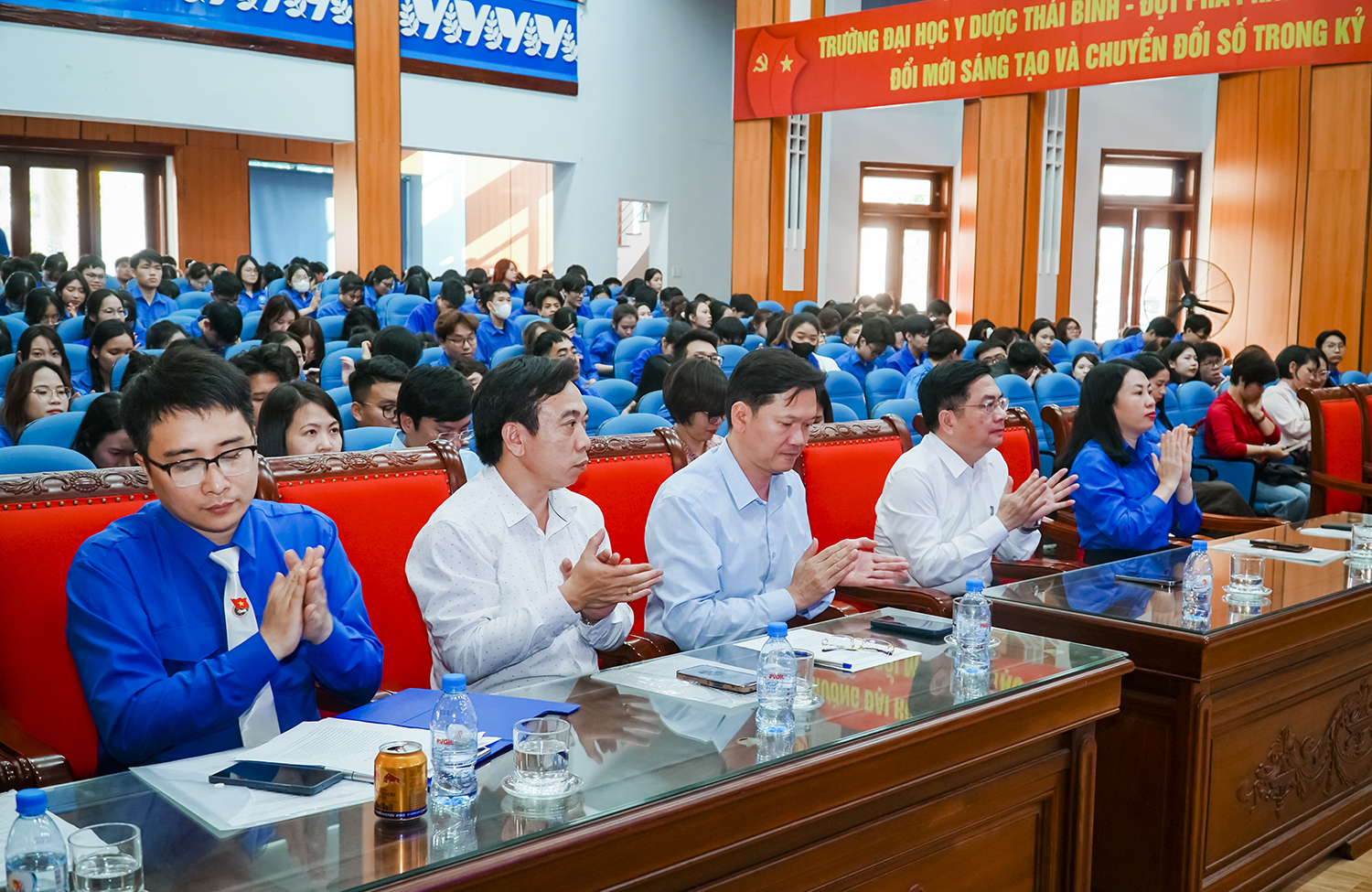 Ghi nhận, đánh giá cao tinh thần chủ động, sáng tạo của Đoàn Thanh niên Nhà trường và đặc biệt là những thành tích nổi bật của sinh viên Trường trong các cuộc thi học thuật, phong trào nghiên cứu khoa học, hoạt động chuyên môn, PGS.TS Nguyễn Quốc Tiến - Bí thư Đảng uỷ Nhà trường đề nghị trong thời gian tới, Đoàn Thanh niên cần tiếp tục đẩy mạnh công tác giáo dục chính trị tư tưởng, bồi dưỡng lý tưởng cách mạng, đạo đức nghề nghiệp cho đoàn viên, sinh viên, đặc biệt là y đức của người cán bộ y tế tương lai; đổi mới mạnh mẽ nội dung, phương thức hoạt động, gắn với nhiệm vụ học tập, nghiên cứu khoa học và chuyển đổi số trong lĩnh vực y tế; phát huy vai trò xung kích, tình nguyện của tuổi trẻ trong các hoạt động vì cộng đồng, chăm sóc sức khỏe Nhân dân. Đồng chí Bí thư Đảng ủy cũng mong muốn Đoàn thanh niên chú trọng phát hiện, bồi dưỡng đoàn viên ưu tú để giới thiệu cho Đảng xem xét, kết nạp; xây dựng môi trường học tập, rèn luyện toàn diện, góp phần hình thành lớp sinh viên vừa hồng, vừa chuyên, có bản lĩnh, trí tuệ và tinh thần phụng sự, xứng đáng với khẩu hiệu: Sinh viên Trường Đại học Y Dược Thái Bình: Sáng trí tuệ - Hồng trái tim - Xây hoài bão lớn.