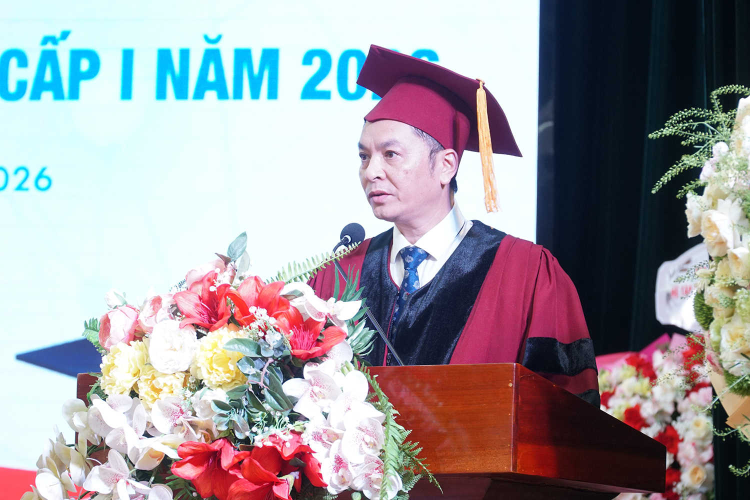 Tân TS Phạm Văn Mẫn đại diện các tân Tiến sĩ, Thạc sĩ, bác sĩ CK cấp II, BSNT, bác sĩ CK cấp I phát biểu tại buổi lễ.