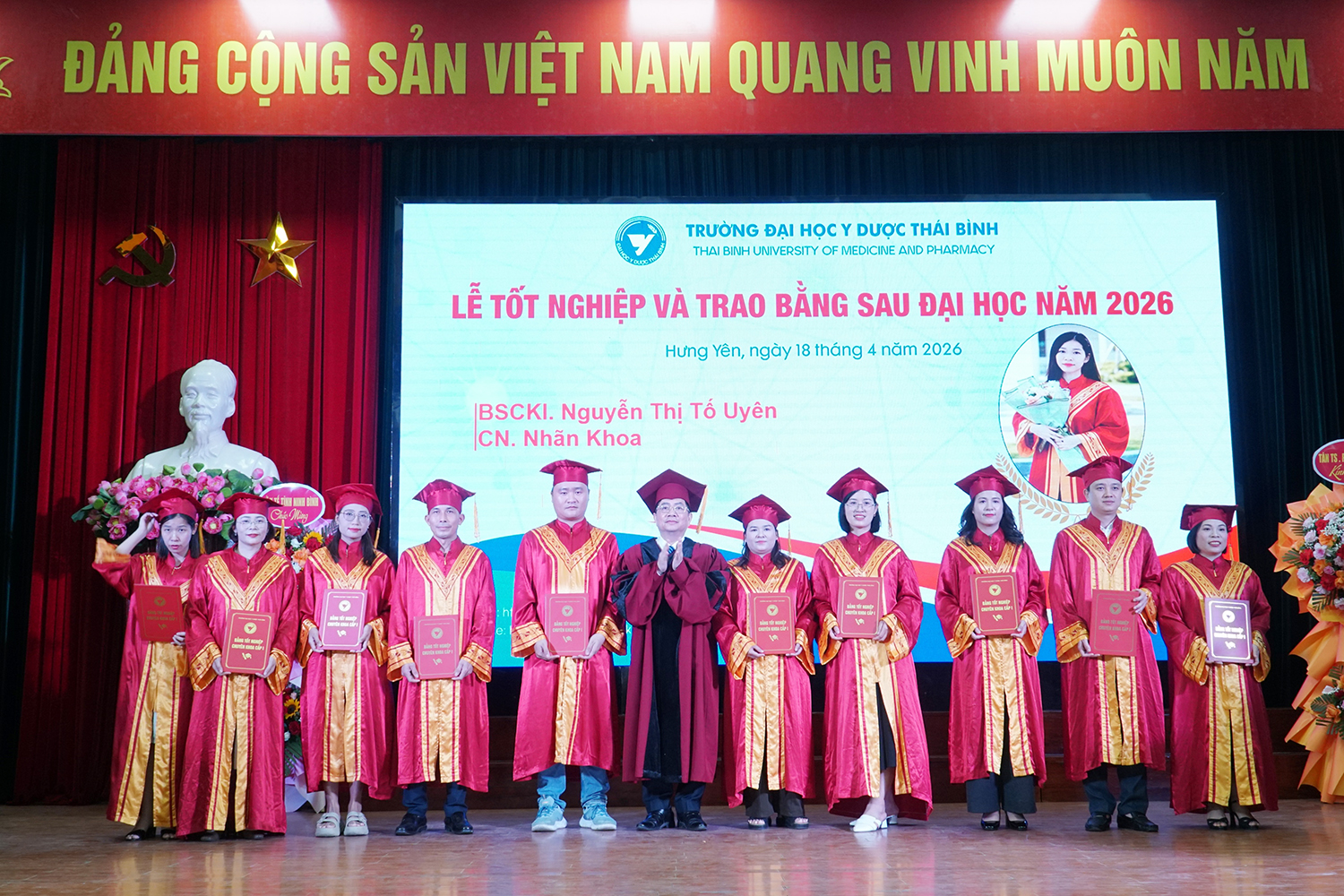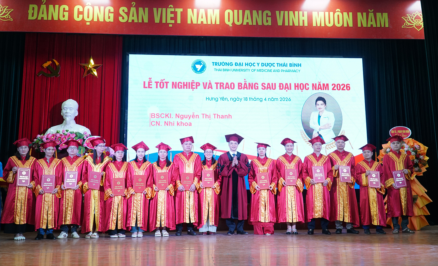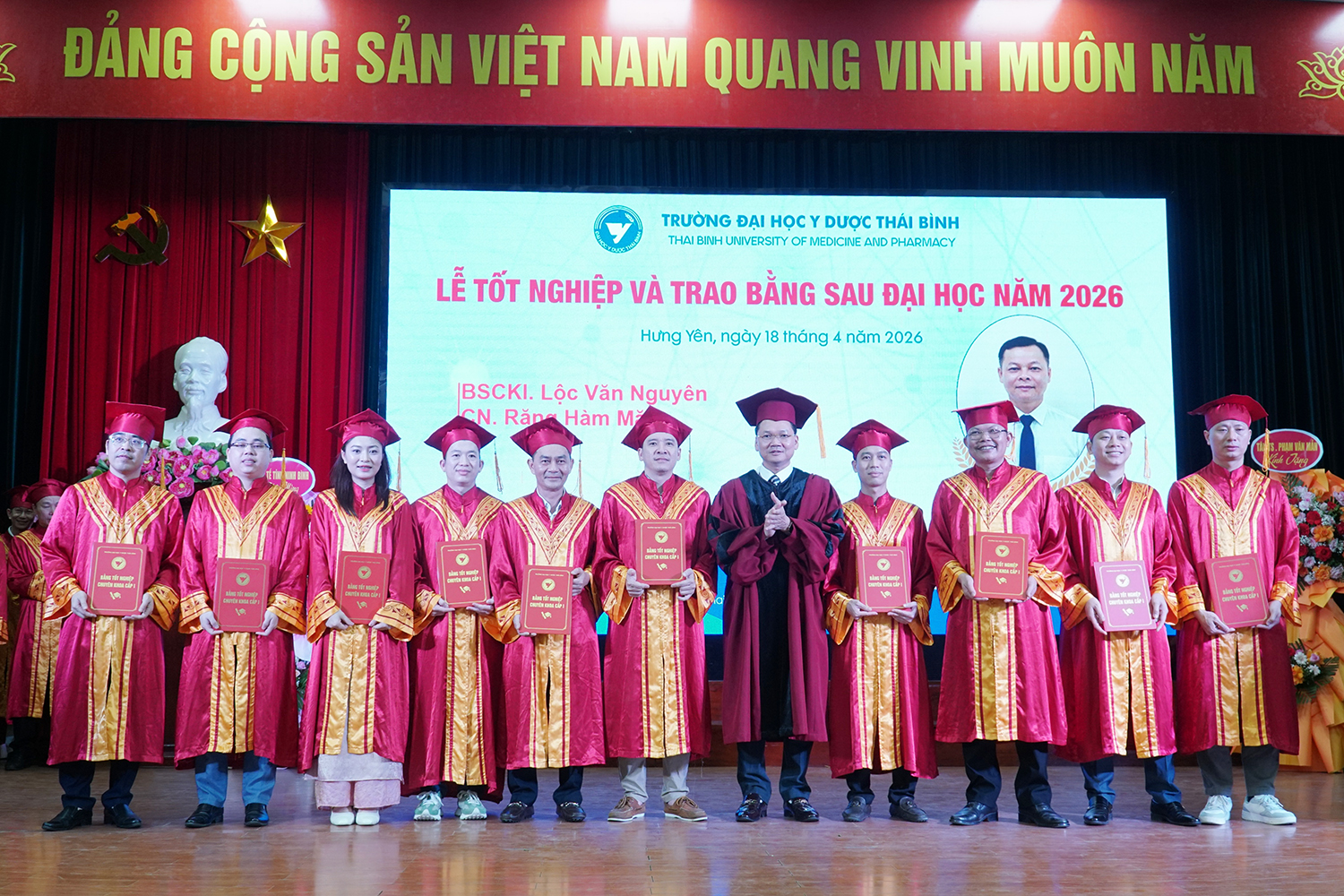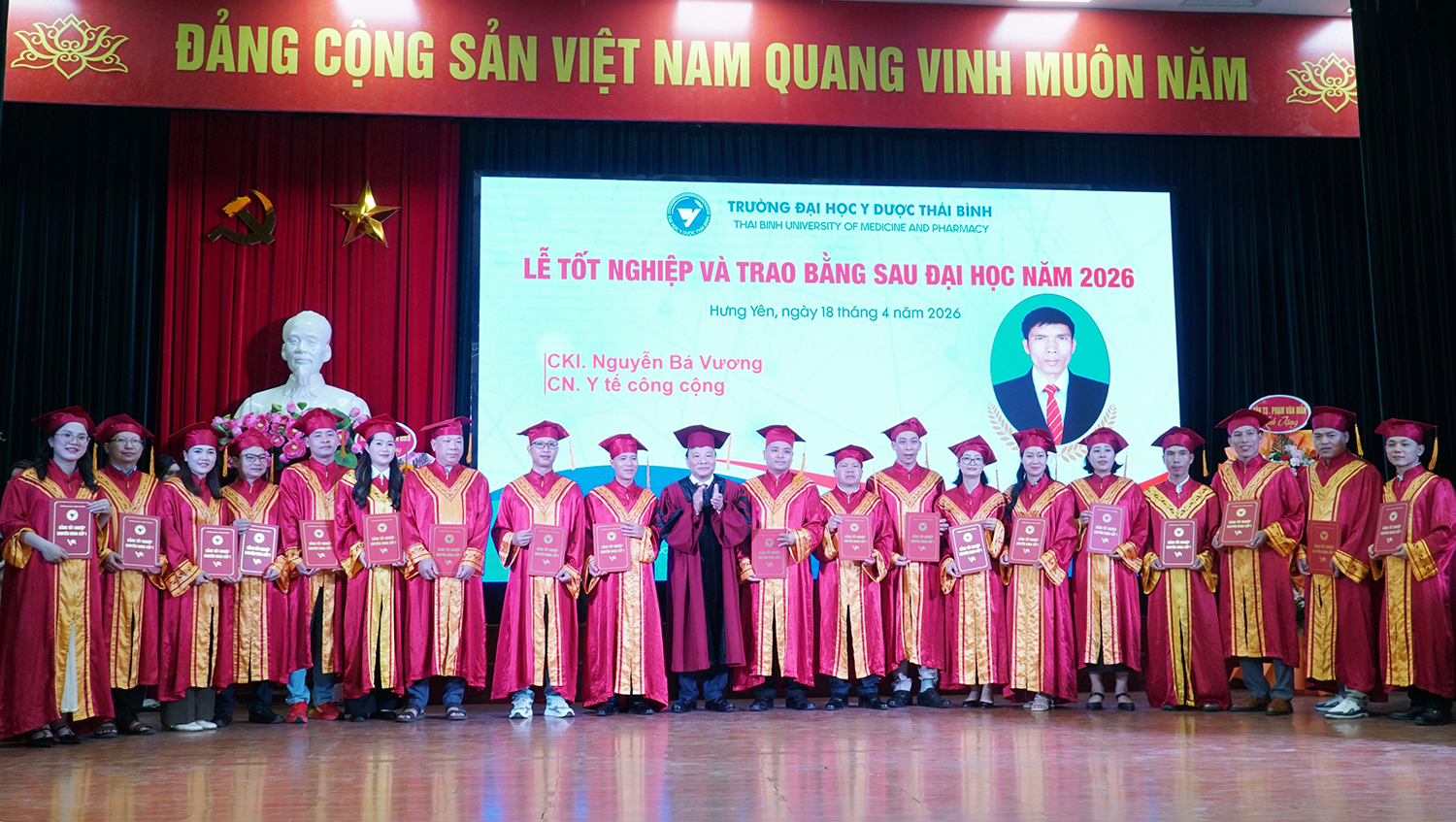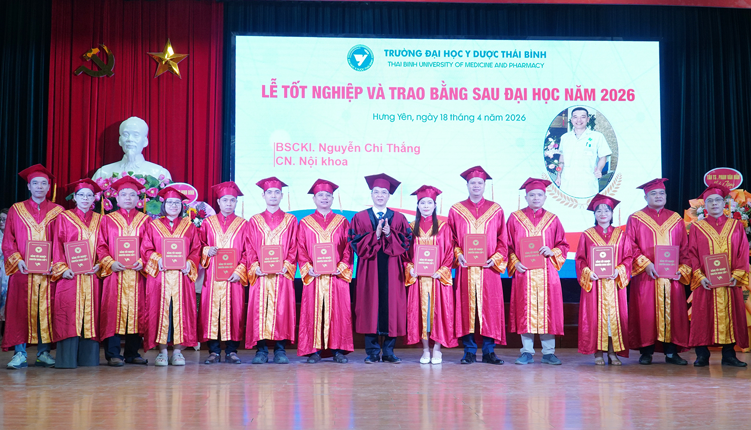 Lễ tốt nghiệp và trao bằng sau đại học năm 2026 không chỉ ghi nhận thành quả học tập của các nghiên cứu sinh, học viên, mà còn tiếp tục khẳng định vai trò đầu tàu của Trường Đại học Y Dược Thái Bình trong đào tạo sau đại học ngành y tế. Với bề dày truyền thống, quy mô đào tạo lớn và không ngừng nâng cao chất lượng, Trường Đại học Y Dược Thái Bình đã, đang và sẽ tiếp tục là địa chỉ tin cậy trong đào tạo nguồn nhân lực chất lượng cao, đáp ứng yêu cầu phát triển của ngành y tế Việt Nam trong giai đoạn mới./.