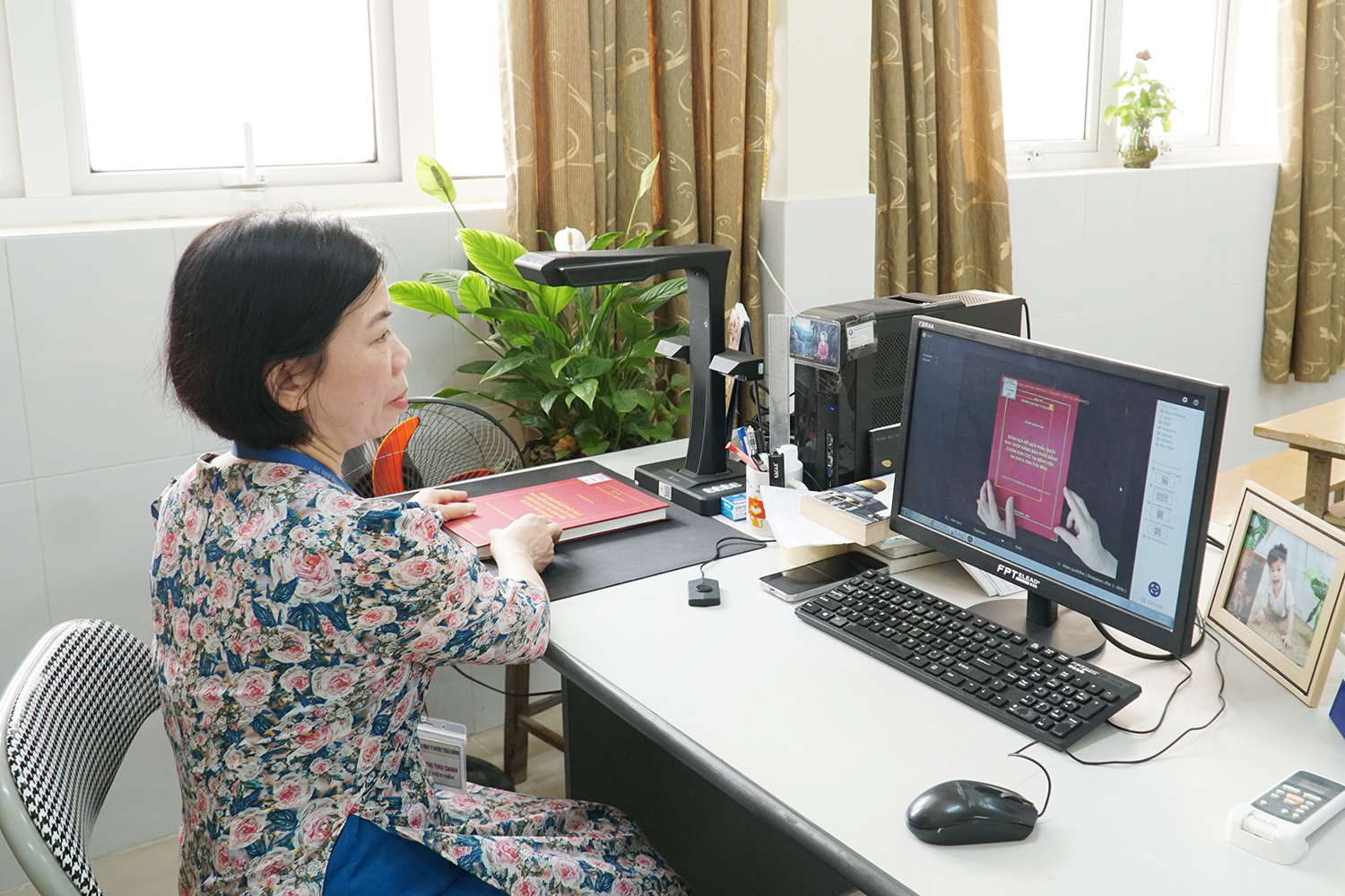 Cán bộ thư viện thực hiện việc số hoá tài liệu.