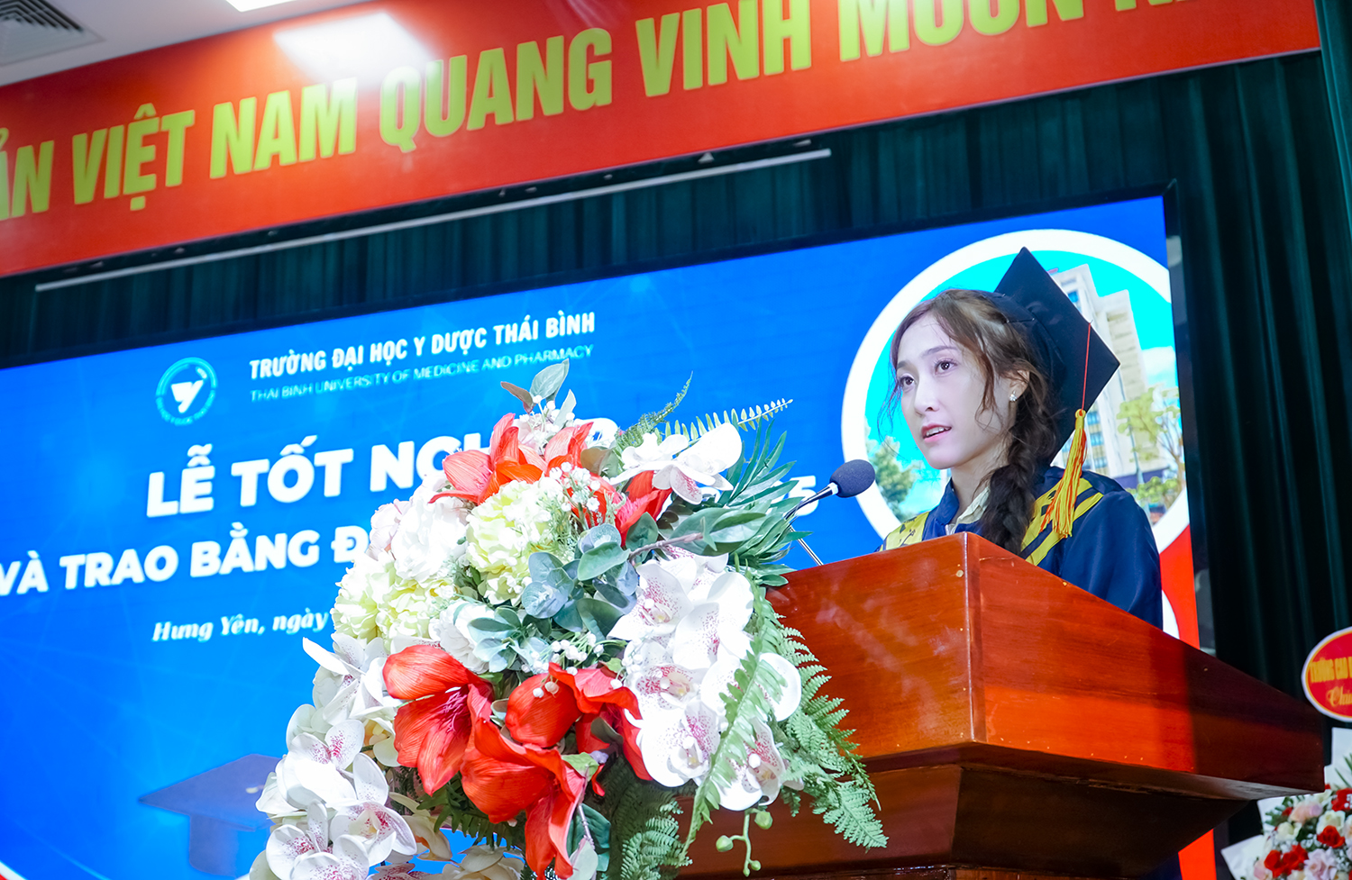 Đại diện cho 981 các bác sĩ, dược sĩ, cử nhân tân khoa, bác sĩ Nguyễn Ngọc Bích đã xúc động, bày tỏ lòng biết ơn sâu sắc tới Ban Giám hiệu, các thầy cô giáo và toàn thể cán bộ, nhân viên của Nhà trường. “Lễ tốt nghiệp hôm nay không chỉ là một cột mốc quan trọng, đánh dấu những năm tháng miệt mài học tập, mà còn là khoảnh khắc để chúng em nhìn lại hành trình đầy ý nghĩa tại mái trường này. Dù mai sau có đi bất cứ nơi đâu, chúng em sẽ luôn khắc ghi những kỷ niệm đẹp, những bài học quý giá và tình cảm ấm áp từ thầy cô, bạn bè” - tân bác sĩ chia sẻ.